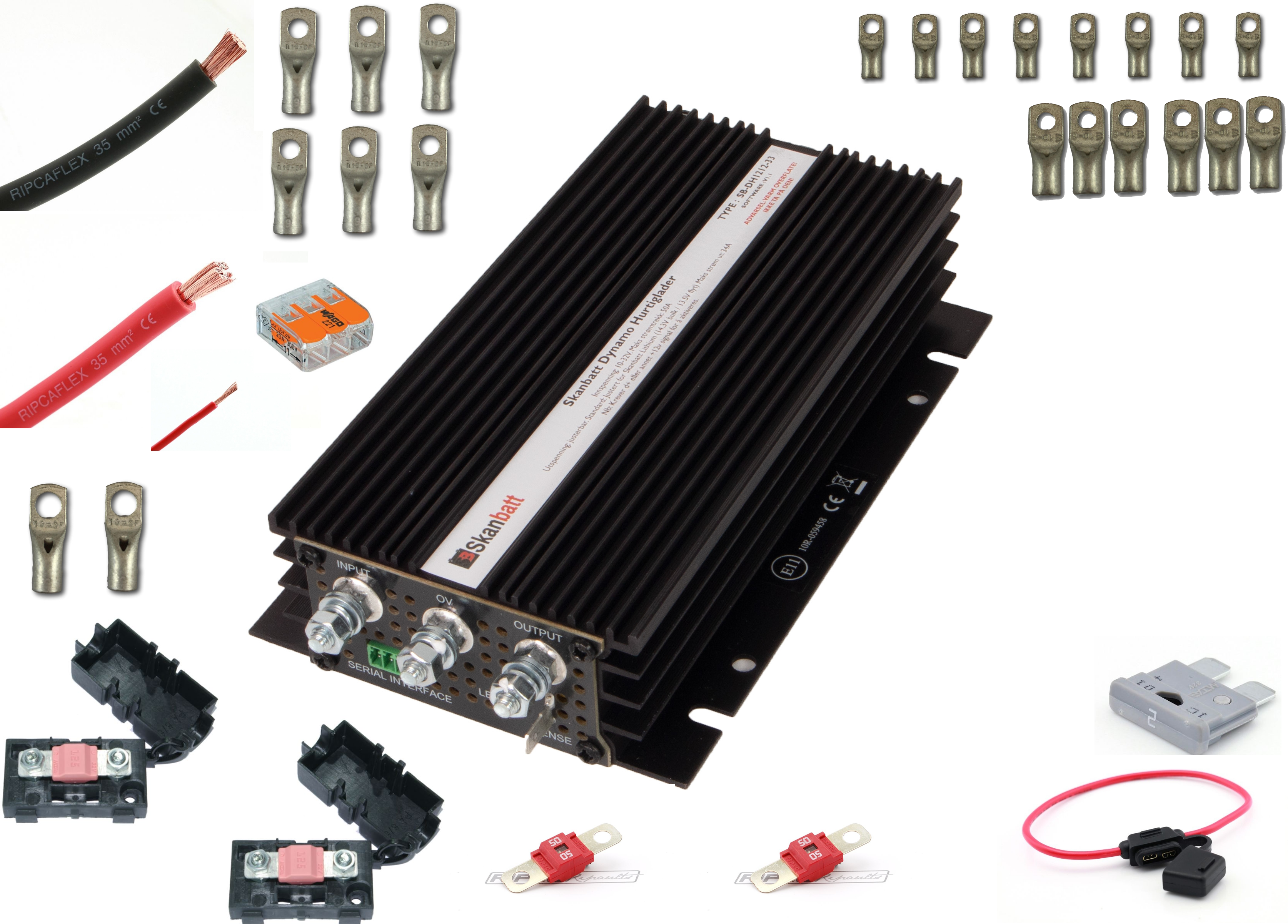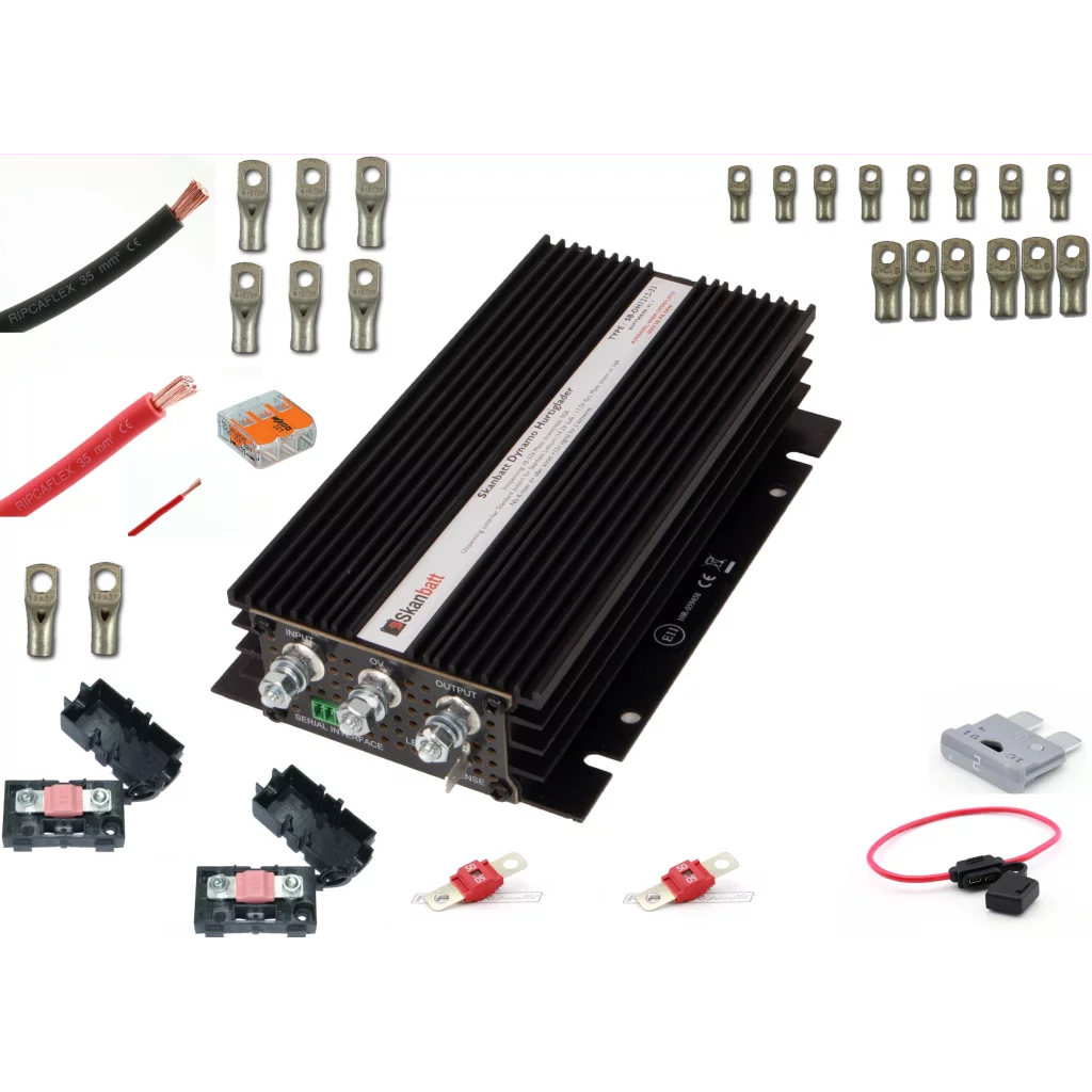 Dette er vår minste DCDC-lader utviklet av Skanbatt og som er spesiallaget for hurtig og trygg montering i bobiler, båter og andre, mobile enheter. Laderen kan brukes både i biler med og uten smartdynamo, og er designet for å gjenbruke kablene som finnes originalt i de fleste bobiler - som betyr rask montering. Enheten kan også benyttes for å lade sekundært batteri i elbiler og andre enheter. Dette kitet er beregnet for helt ny kabling, og kan monteres i tillegg til eksisterende DCDC-ladere i bobiler eller som hovedlader i nye varebiler / elektriske varebiler, pickuper o.l.
