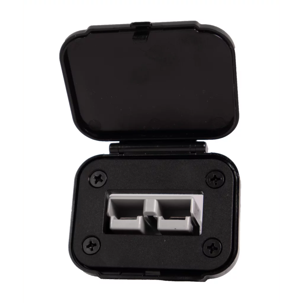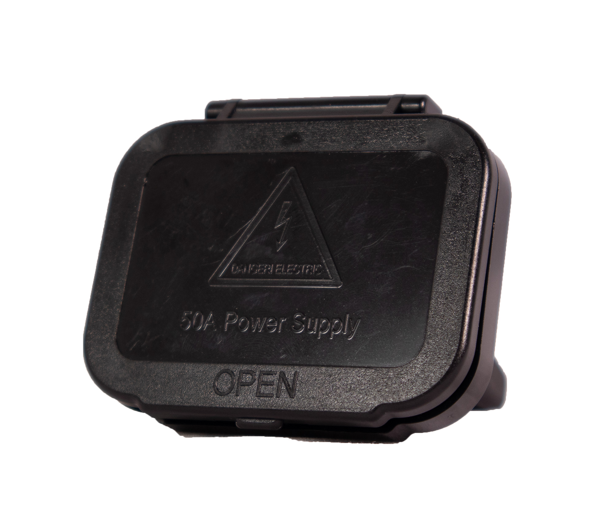 Blir levert komplett med grå 50A kontakt, deksel med lokk og 4 stk bolter med muttere.