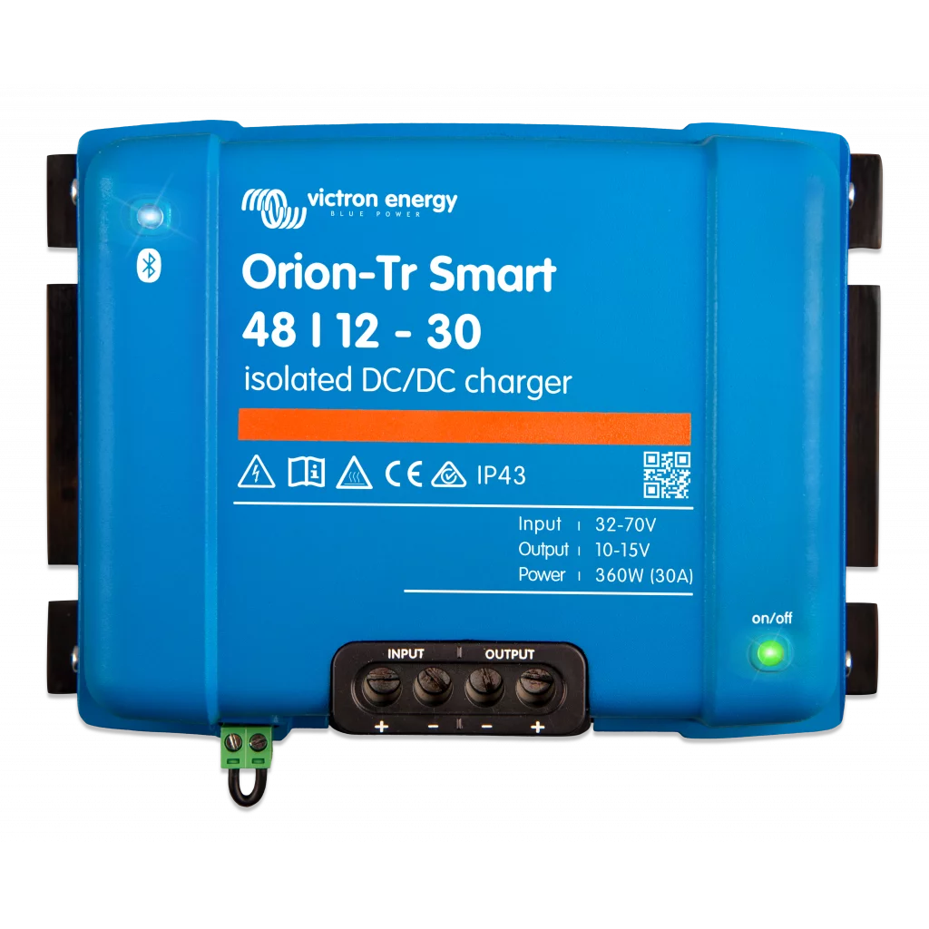 Orion Tr-Smart-lader kan brukes i 12V, 24V og 48V-systemer og er egnet for både blysyre og litiumbatterier. Modeller er tilgjengelige opptil 400W og ubegrensede flere enheter kan kobles parallelt for å øke utgangseffekten.