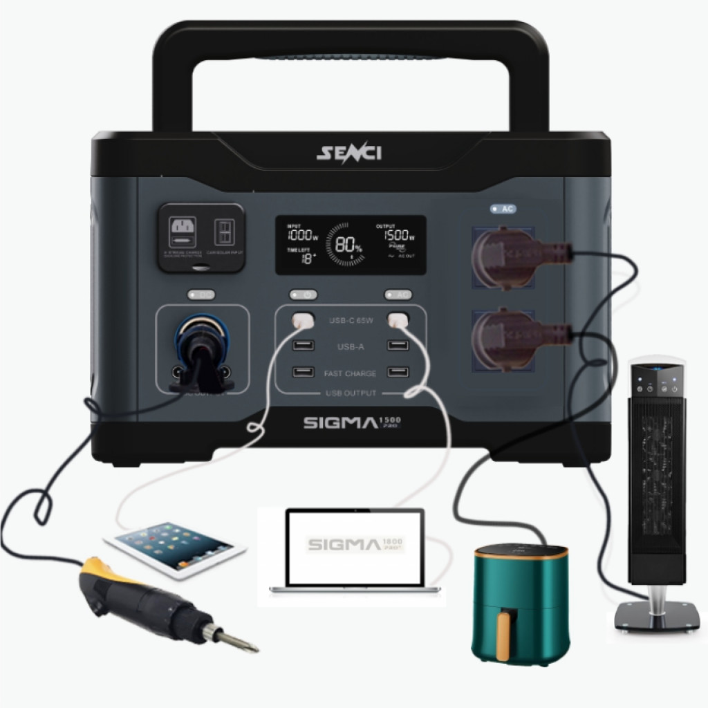 Senci SIGMA1500 er en pålitelig og fleksibel kraftstasjon som gir deg trygg strøm uansett hvor du er. Med 1152 Wh kapasitet og en kraftig inverter på 1500 W kontinuerlig effekt kan du enkelt drive kjøkkenutstyr, kjølebokser, elektronikk og mindre verktøy. Dette gjør den til en ideell løsning for hytte, båt, camping, reise eller som sikker backup hjemme ved strømbrudd.