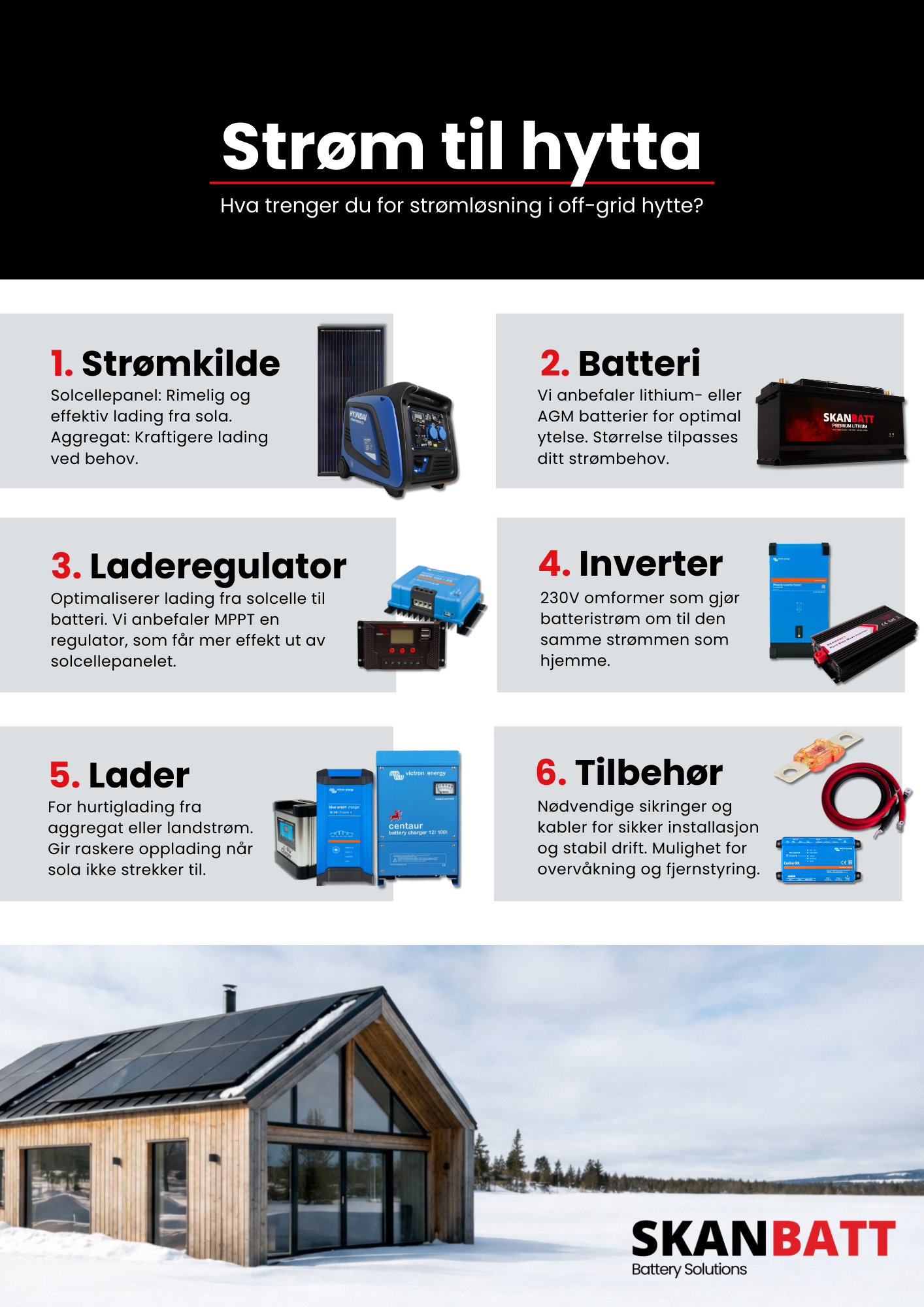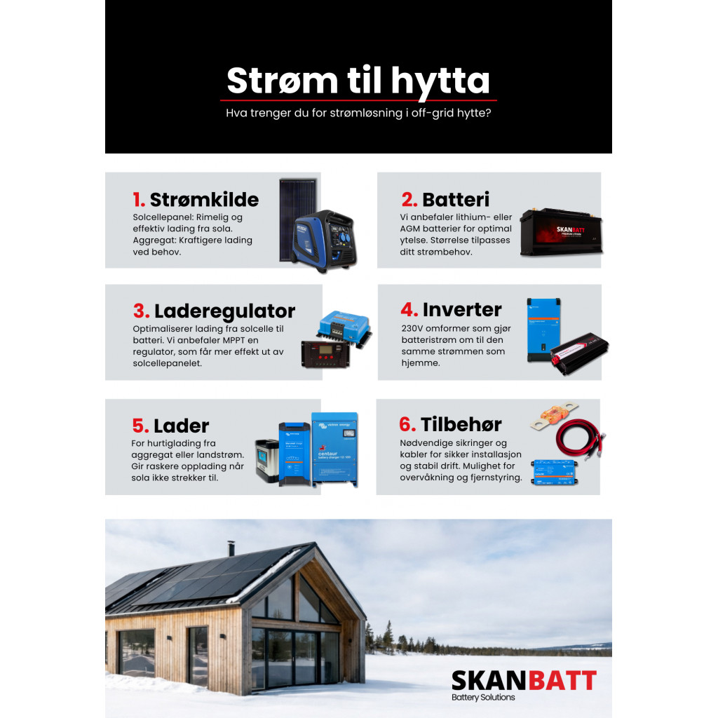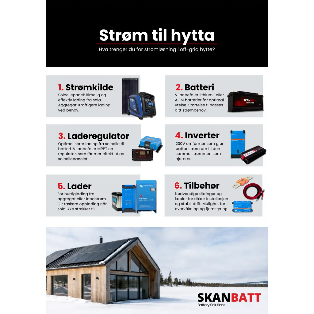 Flyer som viser hvilke komponenter man trenger for strømløsning i en off-grid hytte.