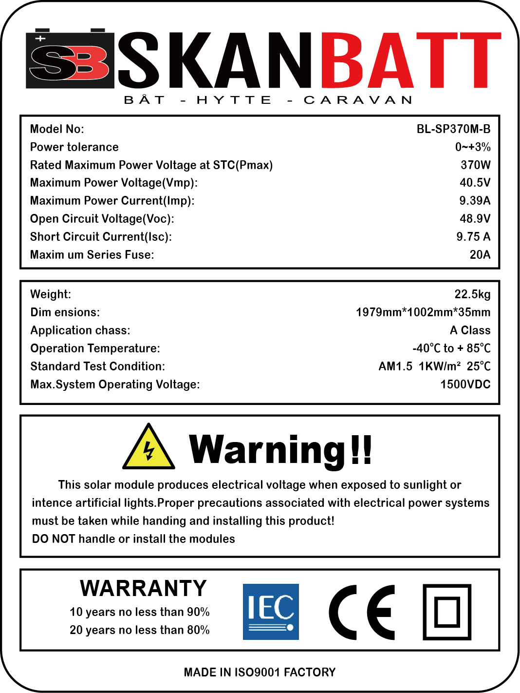 SKANBATT Solcellepanel Mono 370W Sort Modell nr: BL-SP370M-B "All black" Monokrystallinsk solcellepanel av meget høy kvalitet. Vi setter store krav til våre produsenter før vi setter vårt eget merke på produkter, og denne panelserien er ikke noe unntak. Solcellepanelene i denne serien er utprøvd over flere