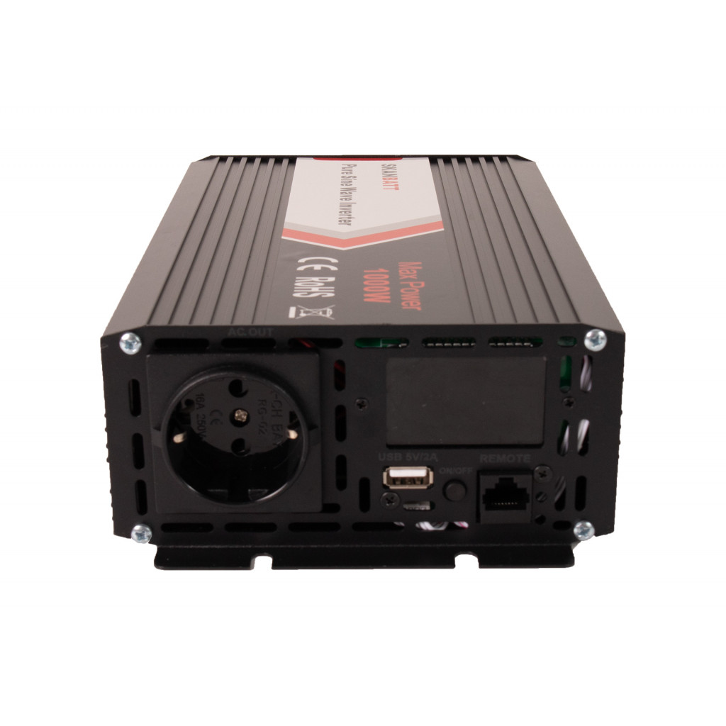 Inverteren har et digitalt display i fronten som gir deg informasjon om batterispenning, frekvens og temperatur.