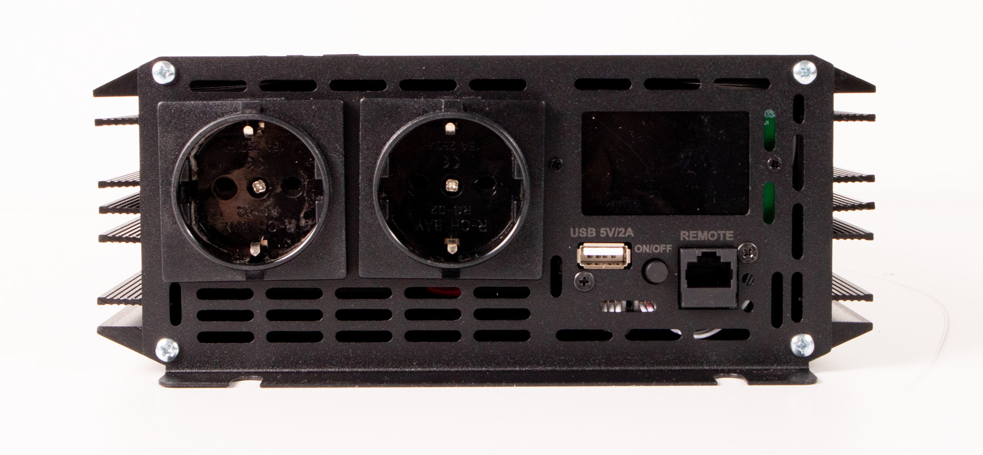 Inverteren har et digitalt display i fronten som gir deg informasjon om batterispenning, frekvens og temperatur.