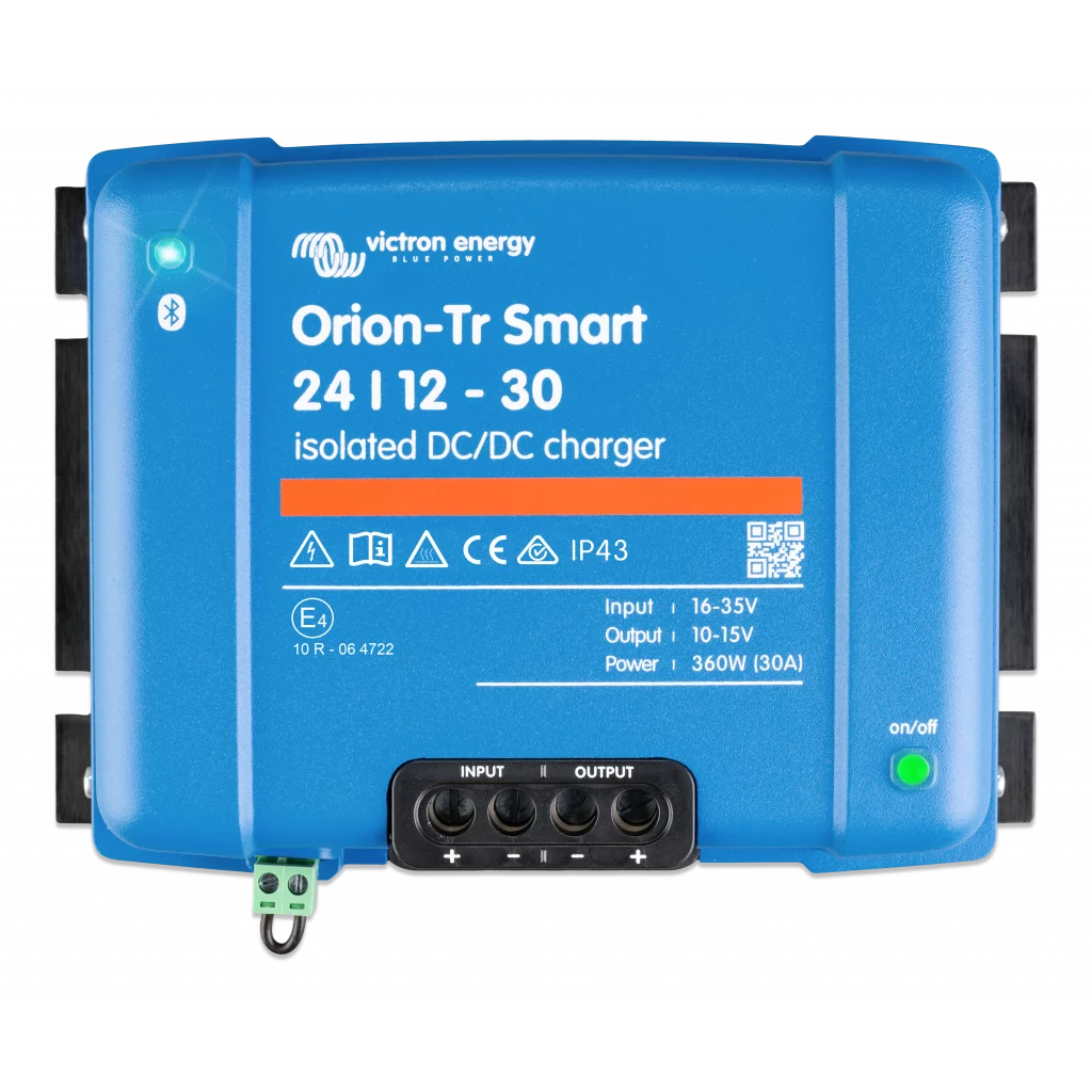 Orion Tr-Smart-lader kan brukes i 12V- eller 24V-systemer og er egnet for både blysyre og litiumbatterier. Modeller er tilgjengelige opptil 400W og ubegrensede flere enheter kan kobles parallelt for å øke utgangseffekten.