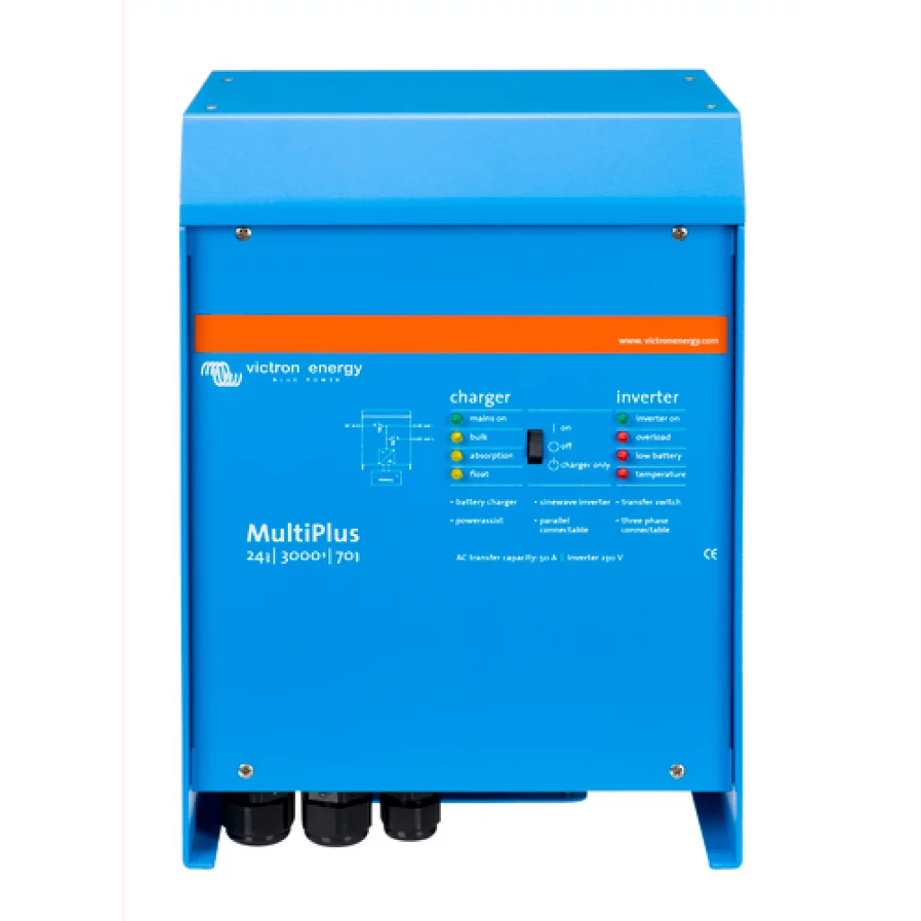 MultiPlus er en kraftfull ekte sinuskurve inverter, en avansert batterilader som har adaptiv ladeteknologi og høyhastighets AC overføring bryter i en enkel, kompakt kabinett.