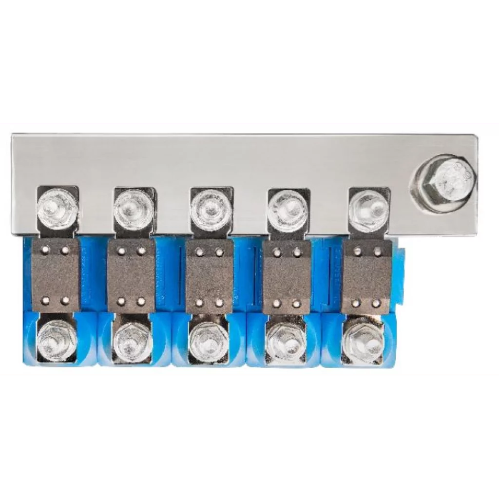 Dette er en strømskinne med høy kvalitet fra Victron. Skinnen er uisolert, beregnet for å sikre inntil 5 underkurser med ordinære Megasikringer (holdere og sikringer følger ikke med).