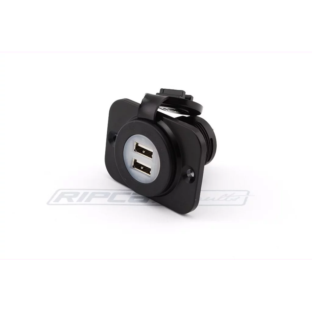 Innfelt strømuttak for 12V eller 24V-systemer med to høyeffekts USB-porter for hurtiglading av iPad, smarttelefoner, nettbrett og andre mobile enheter mens du er på farten. Denne kontakten gir 10W (2.1A @ 5V). En blå LED lyser opp USB-portene med en myk glød for å indikere at kontakten er strømforsynet.