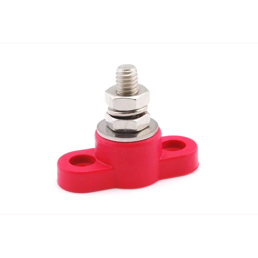 Isolert bolt i rustfritt stål - for å koble sammen flere større kabler Tåler høy strømstyrke M8 Bolt og mutter av rustfritt stål Chassis av forsterket plastikk (PBT UL94 V0) Kan skrus fast til underlag med to skruer