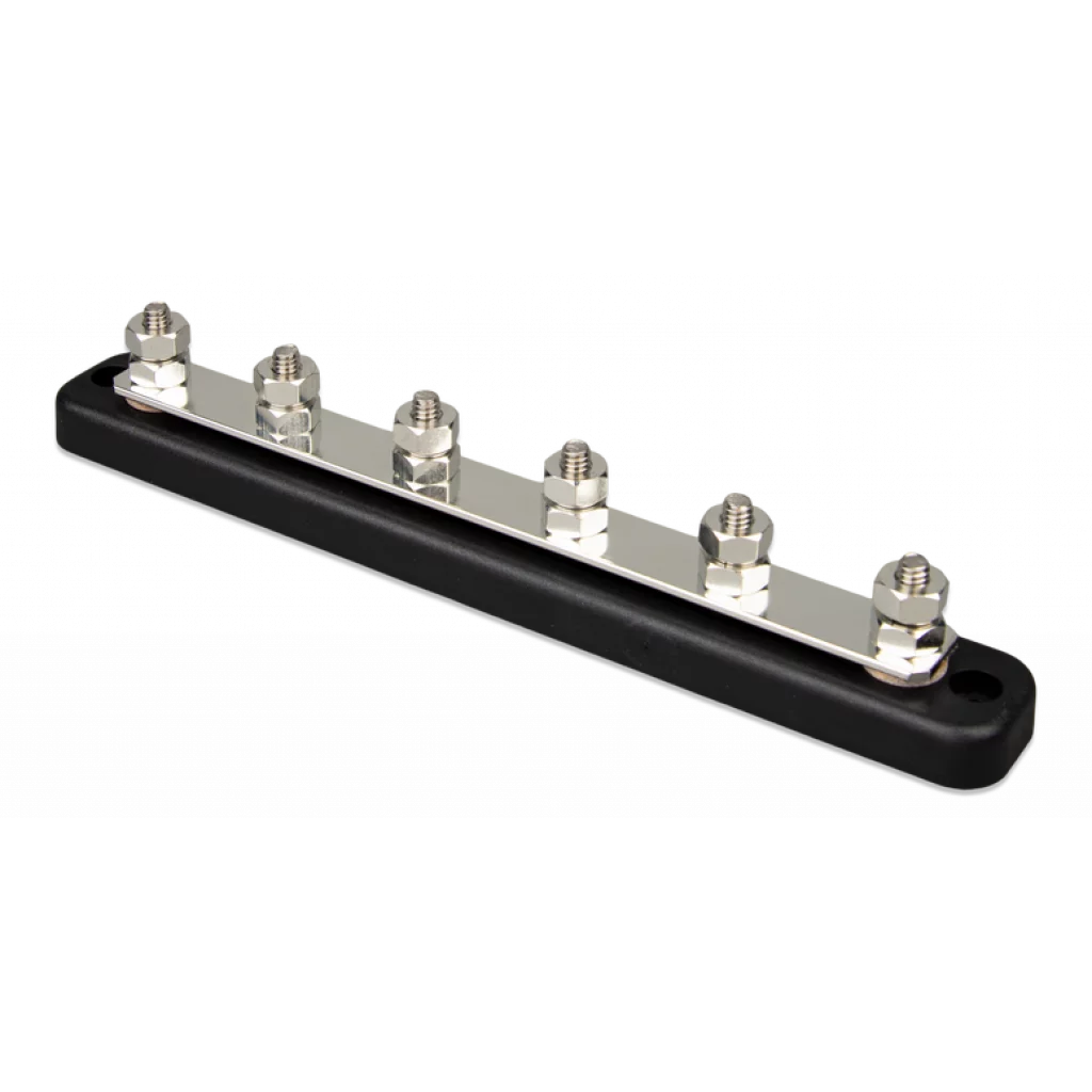 VICTRON Busbar 150A 6P + Deksel 150, 250 og 600 ampere Samleskinner brukes for høy strømfordeling og gir samtidig tilkoblinger for batterier og / eller likestrømsutstyr. Vi tilbyr et antall samleskinner med forskjellige nåværende rangeringer, og et