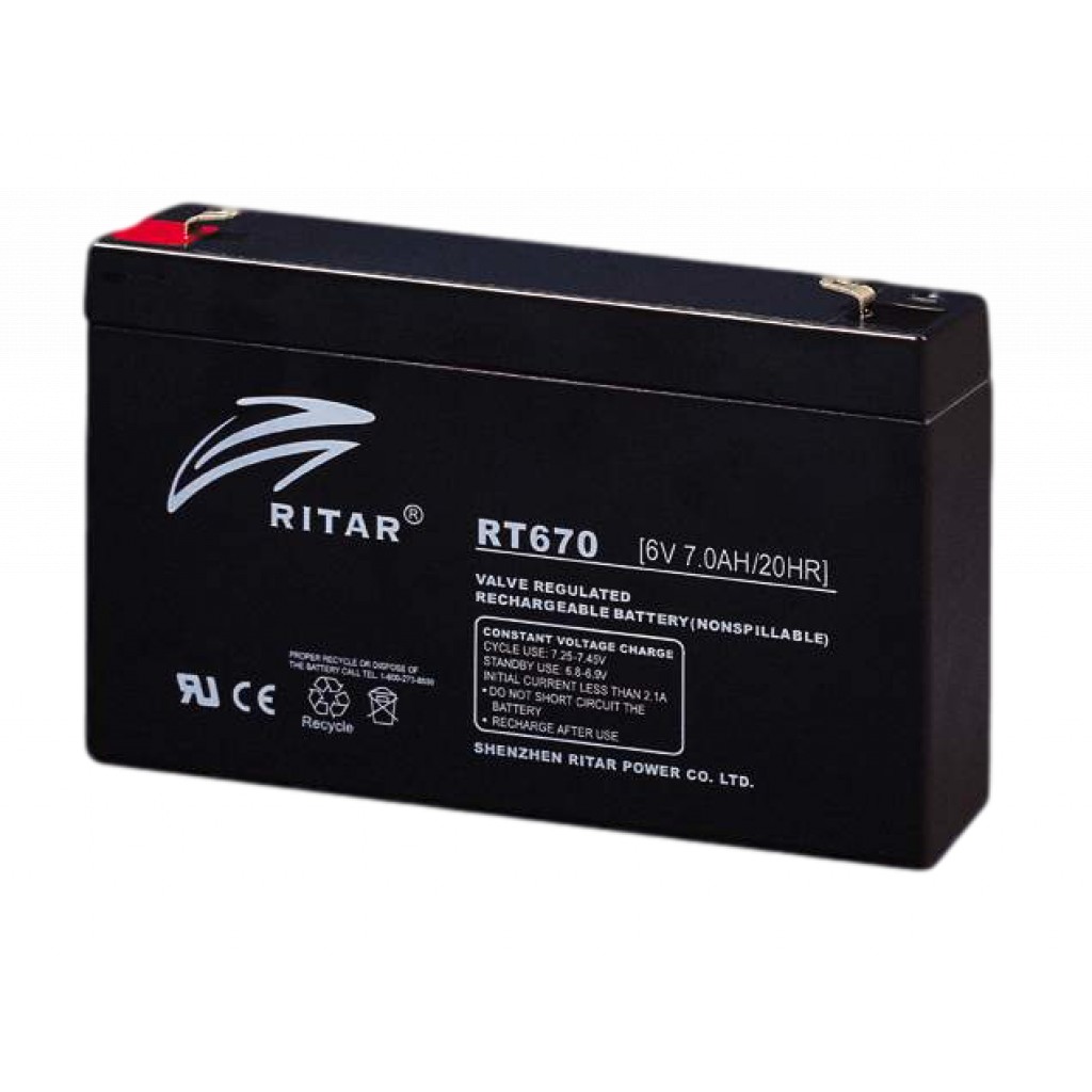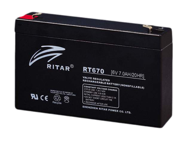 RT670 fra Ritar er et vedlikeholdsfritt, forseglet AGM-batteri med 6V spenning og 7Ah kapasitet. Batteriet har et smalt design og lav vekt, og egner seg godt for UPS, nødstrøm, backup-løsninger og alarmsystemer hvor det er begrenset plass.