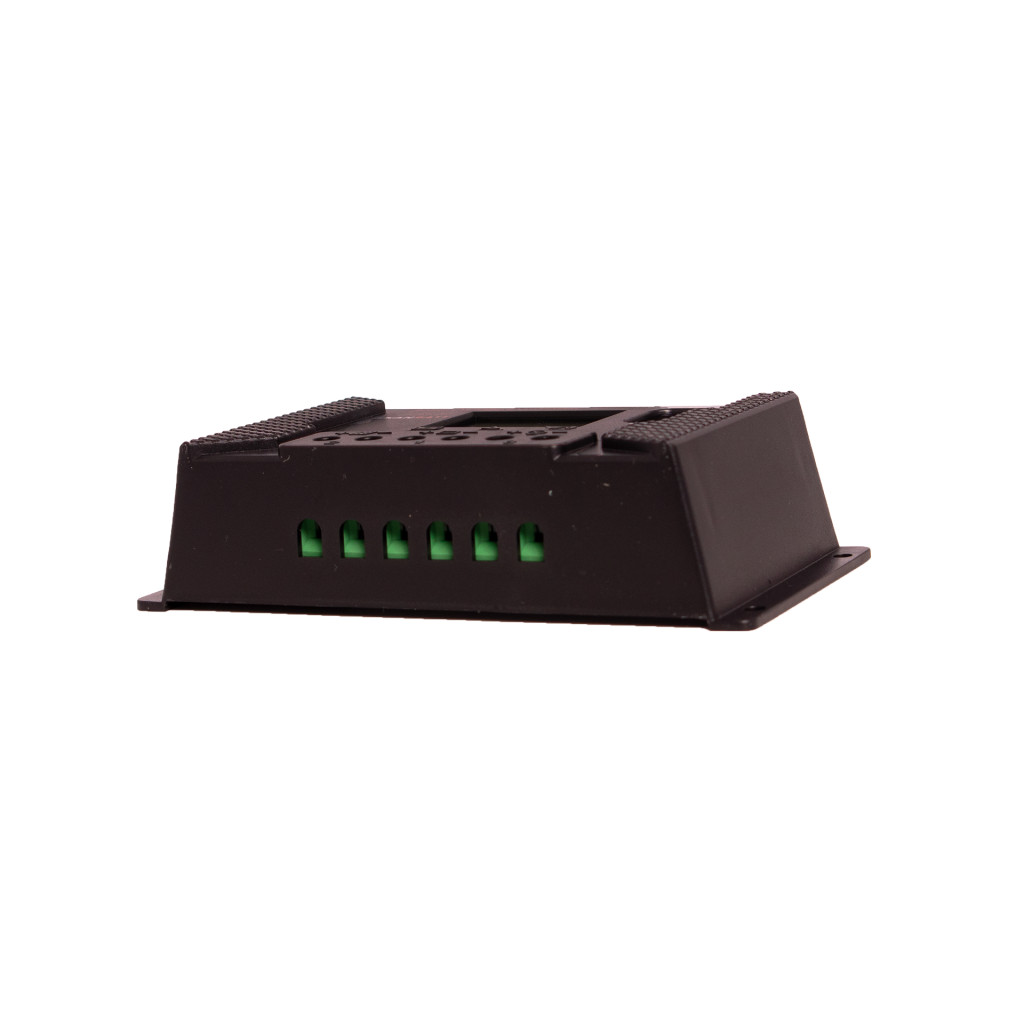 PWM solcelle regulator med god kvalitet til fornuftig pris. Regulatoren er enkel men allikevel avansert nok til å kunne brukes med alle typer paneler og til å lade de aller fleste batterityper.