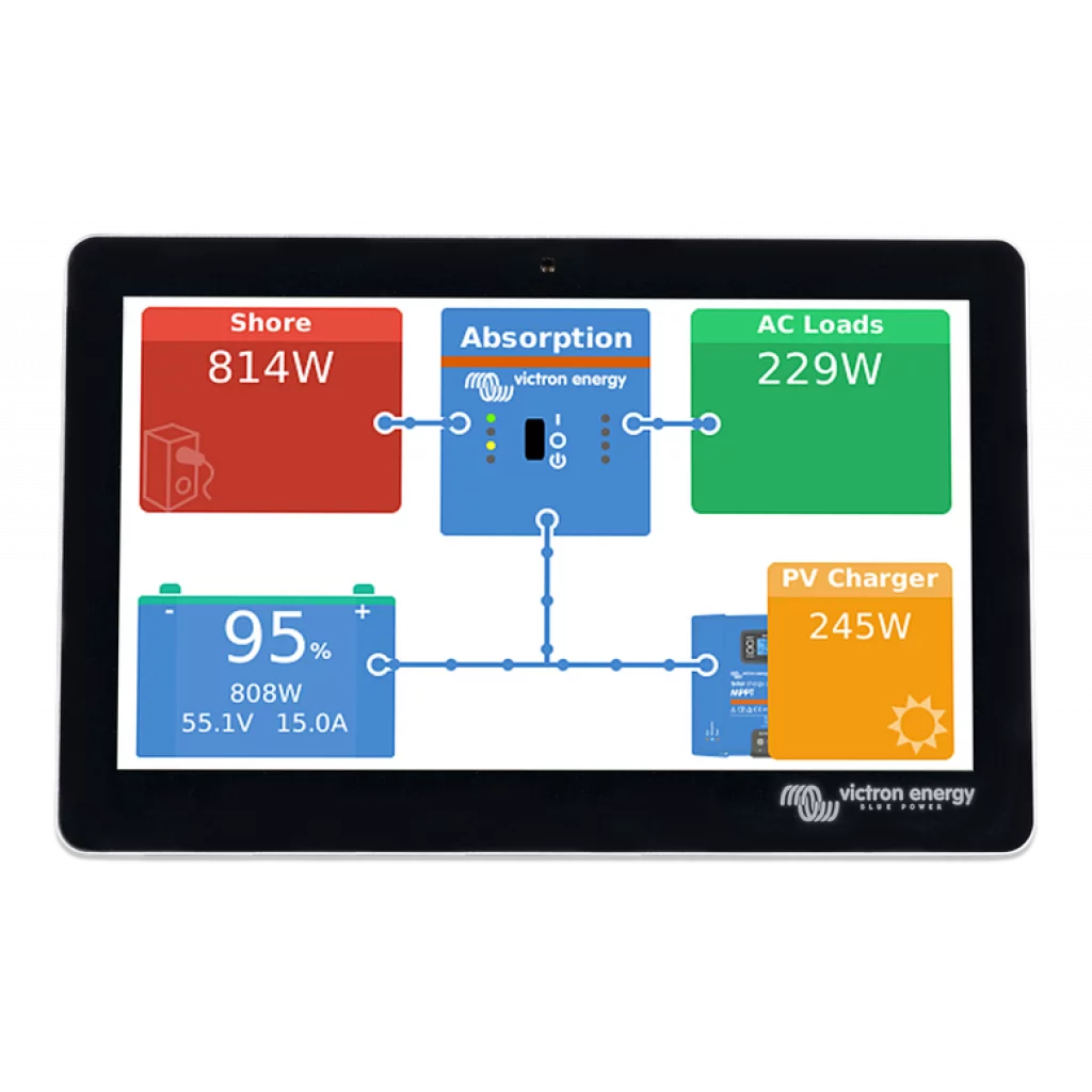 Når det er koblet til Cerbo GX med en kabel, gir det supertynne vanntette designet, toppmonterbare oppsettet og den enkle installasjonen en stor fleksibilitet ved opprettelse av en klar og ren dashbord.