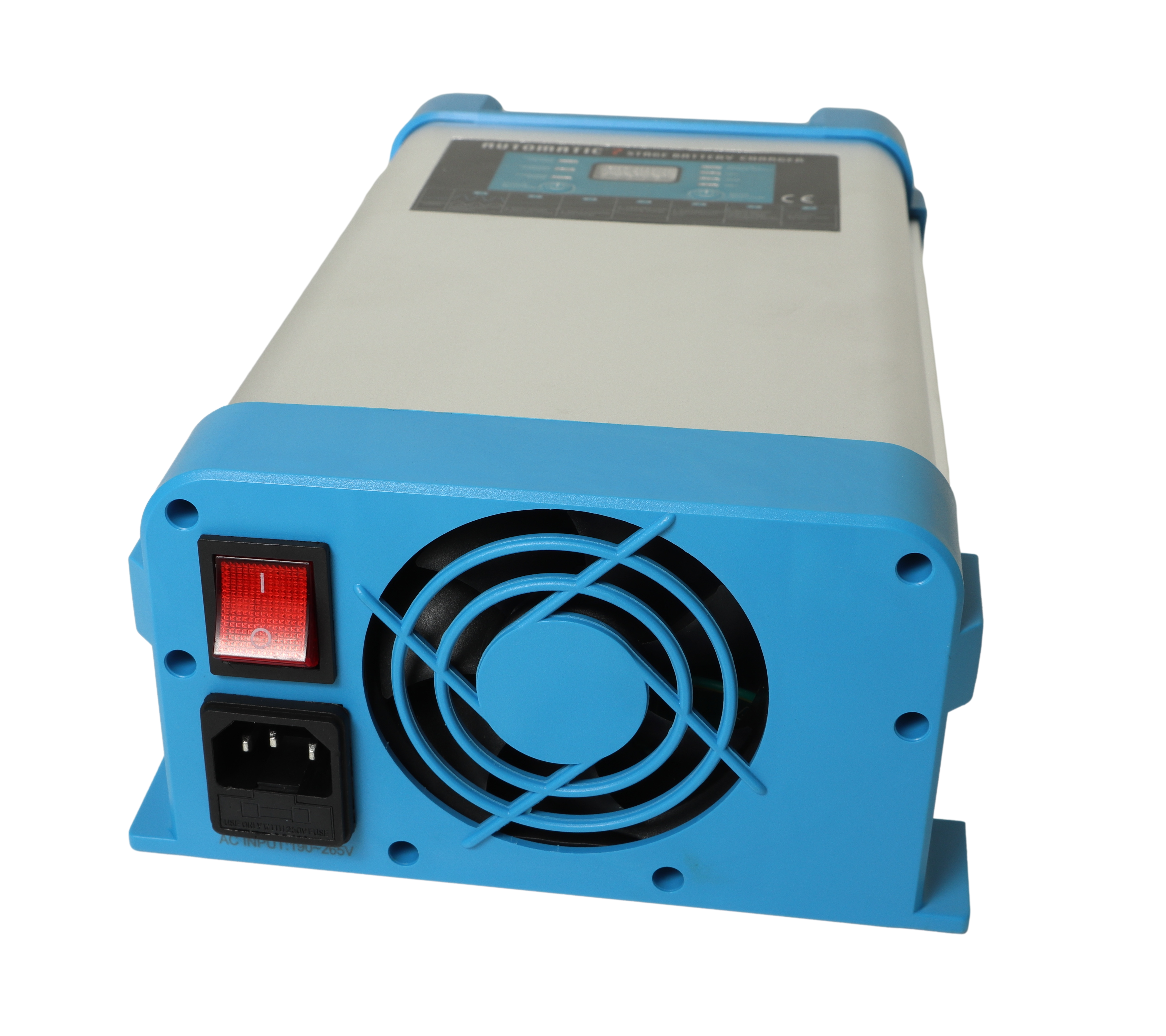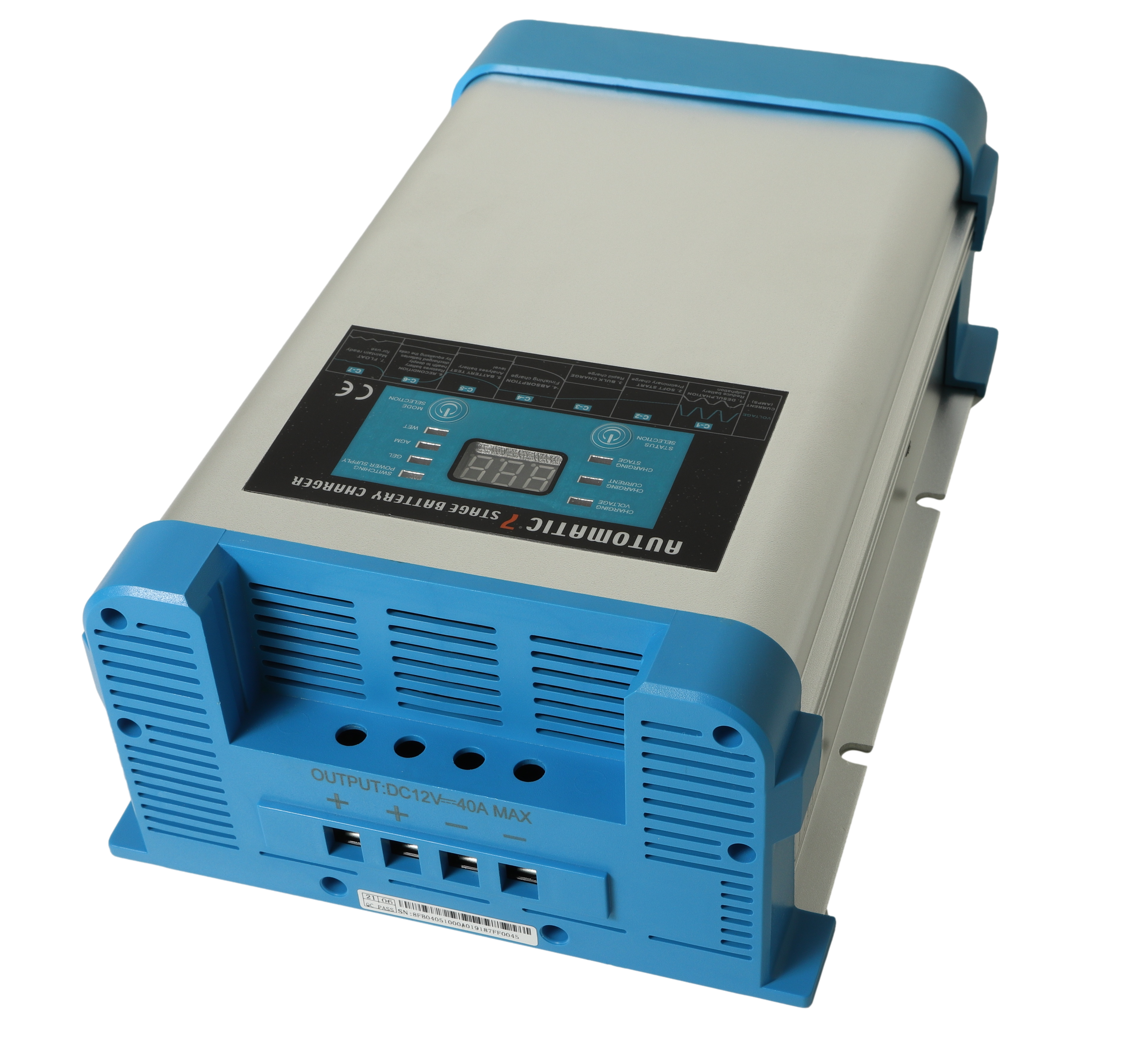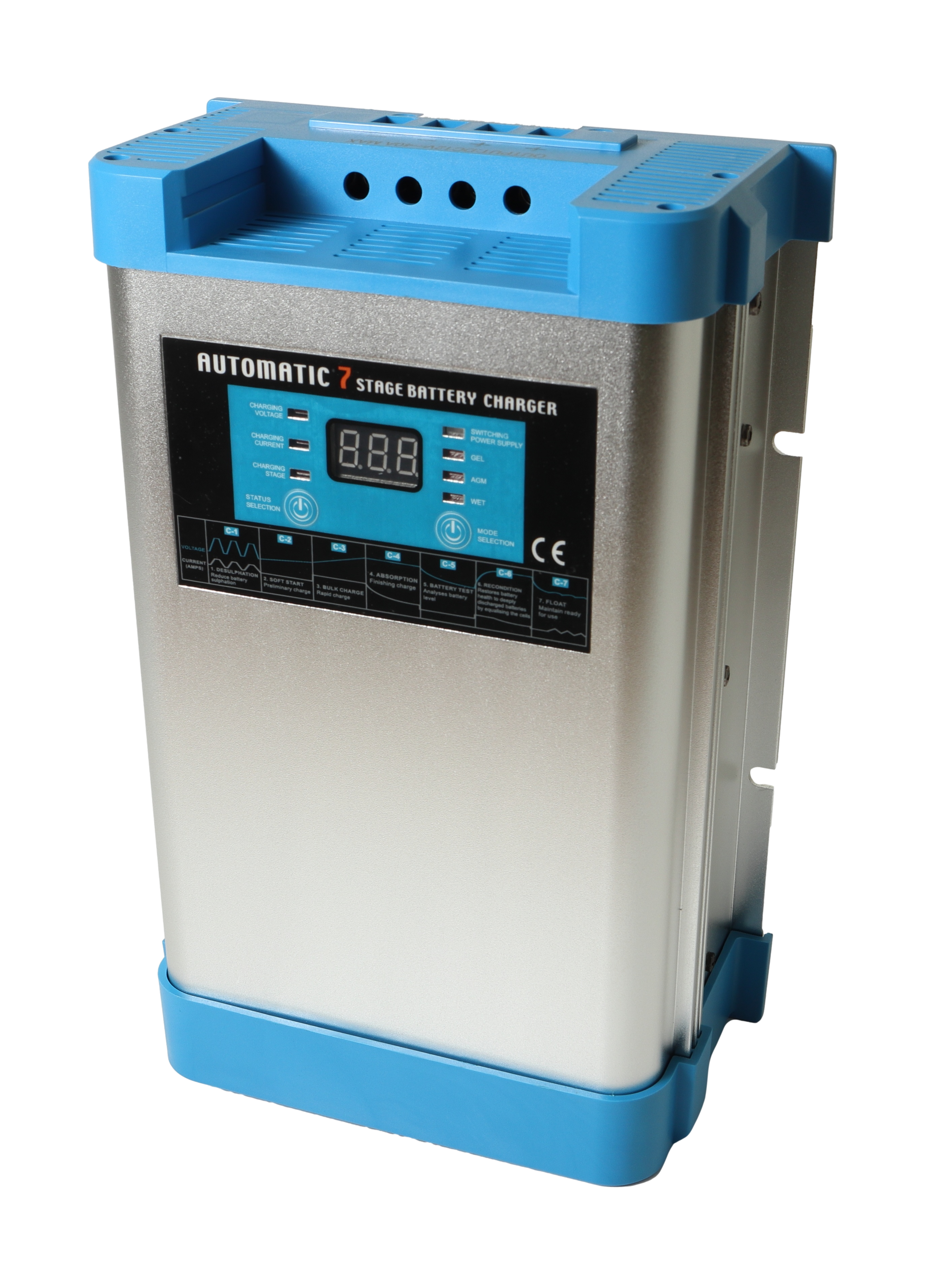 - Digitalt display viser spenning (V), ladestrøm (A) og hvor langt laderen er kommet i ladeprosessen
