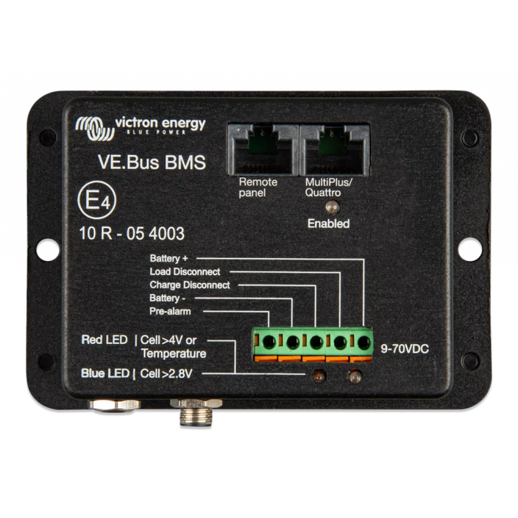 Hver enkelt celle i et LiFePO4-batteri må beskyttes mot overspenning, underspenning og for høy temperatur. Victron LiFePO4 batterier har integrert balanse-, temperatur- og spenningsregulering (akronym: BTV) og kobles til VE.Bus BMS med to M8 sirkulære tilkoblingsledninger. BTV-ene fra flere batterier kan tilkobles etter hverandre i rekkefølge (daisy-chained).