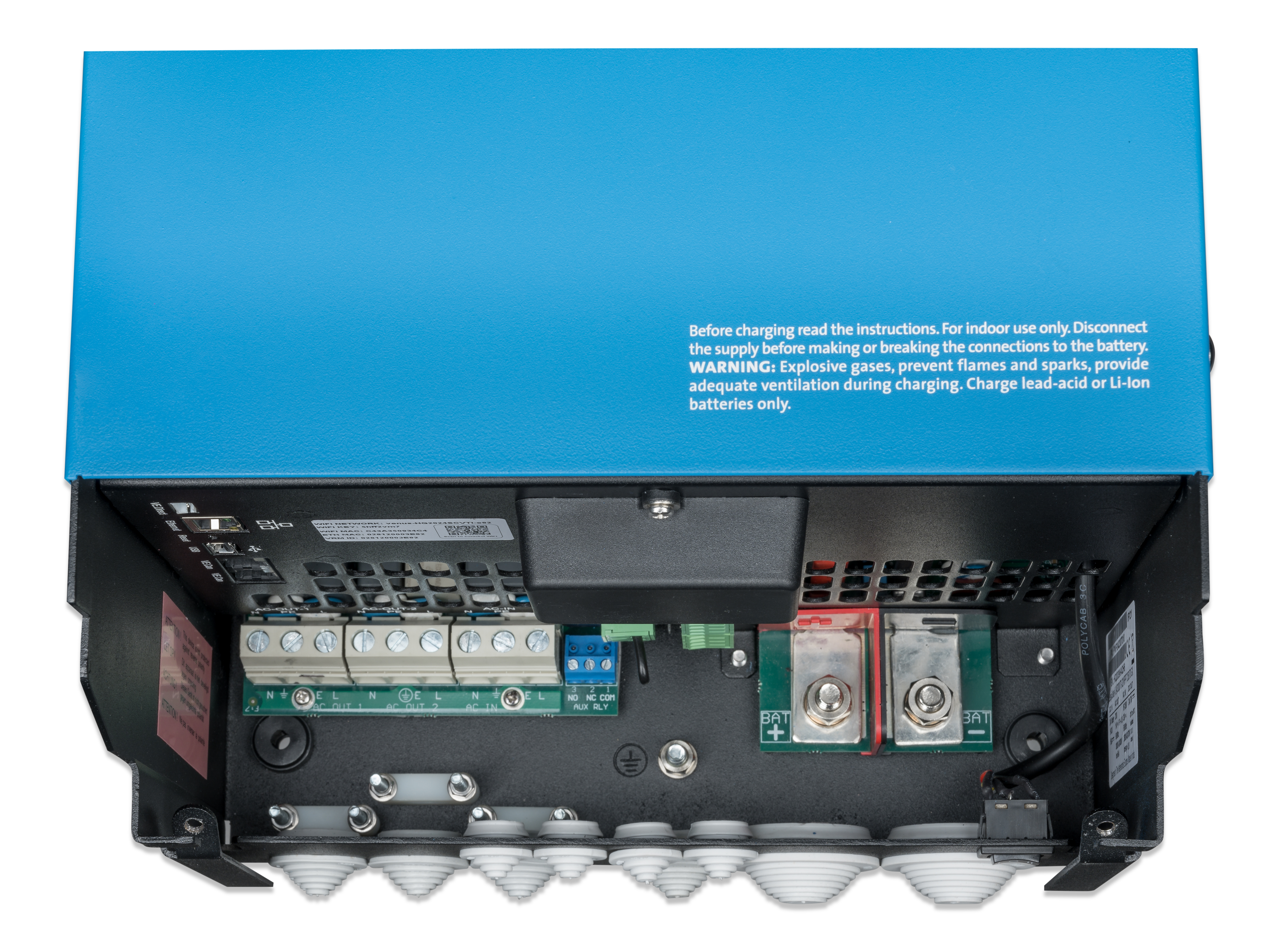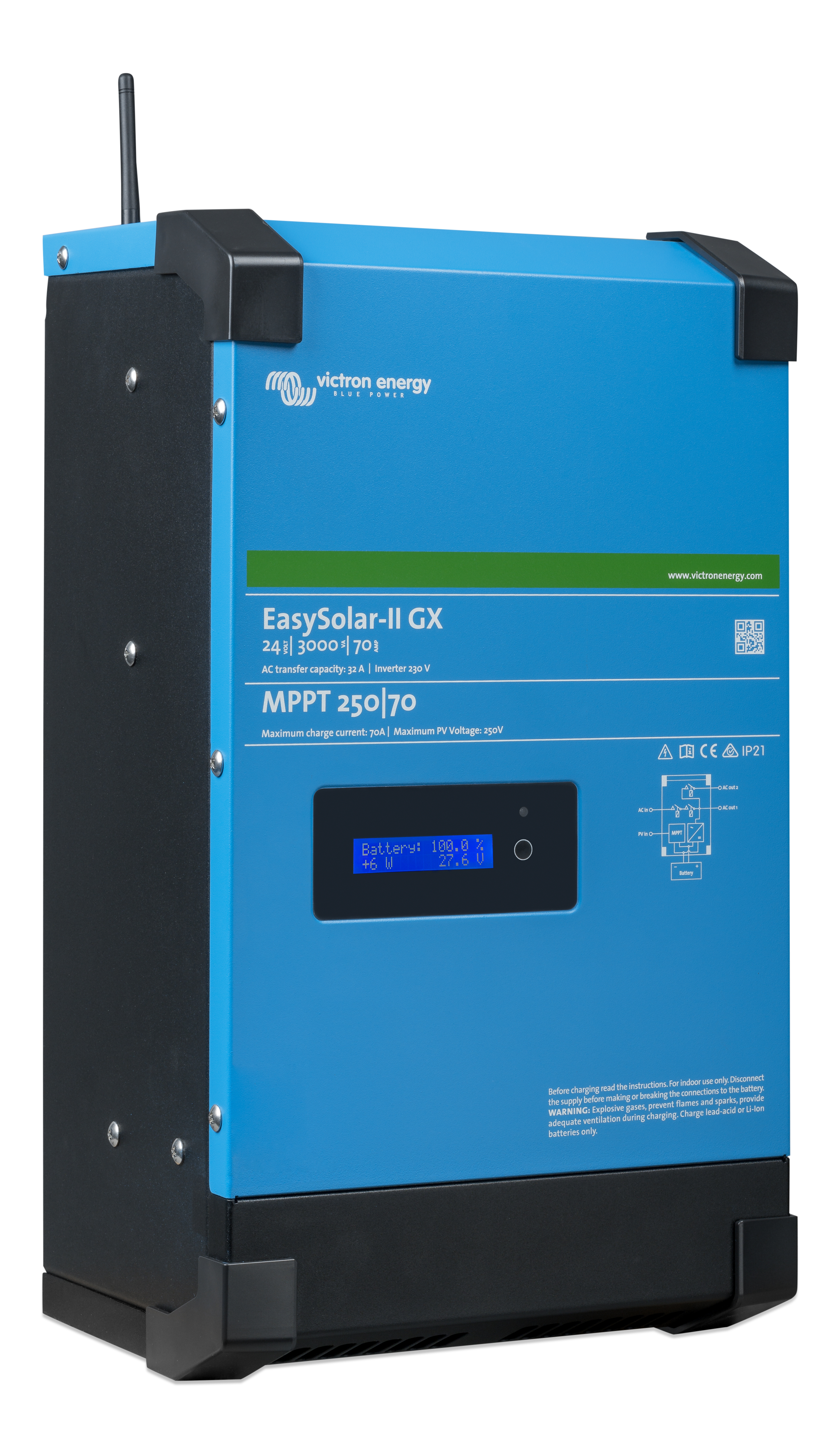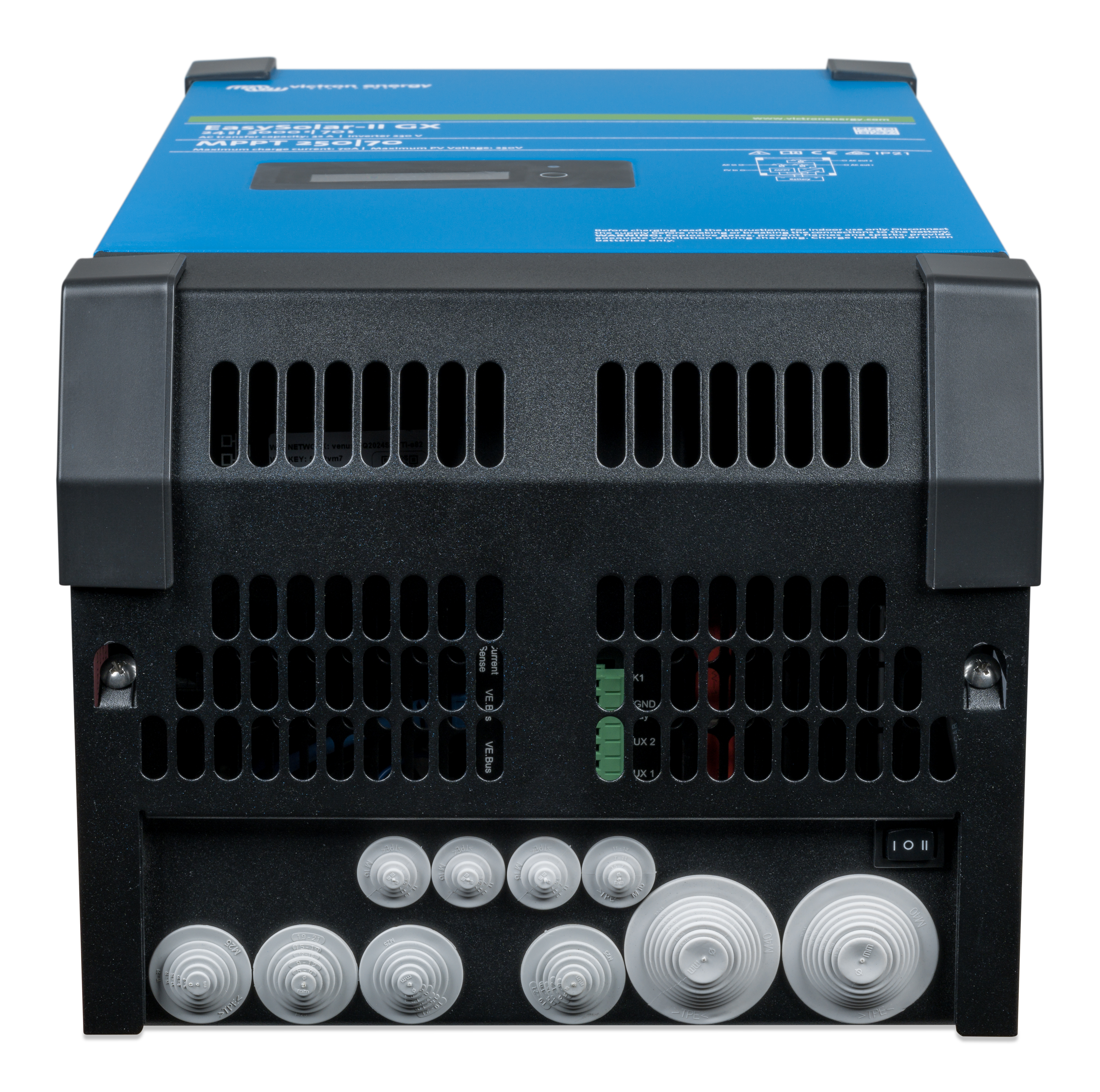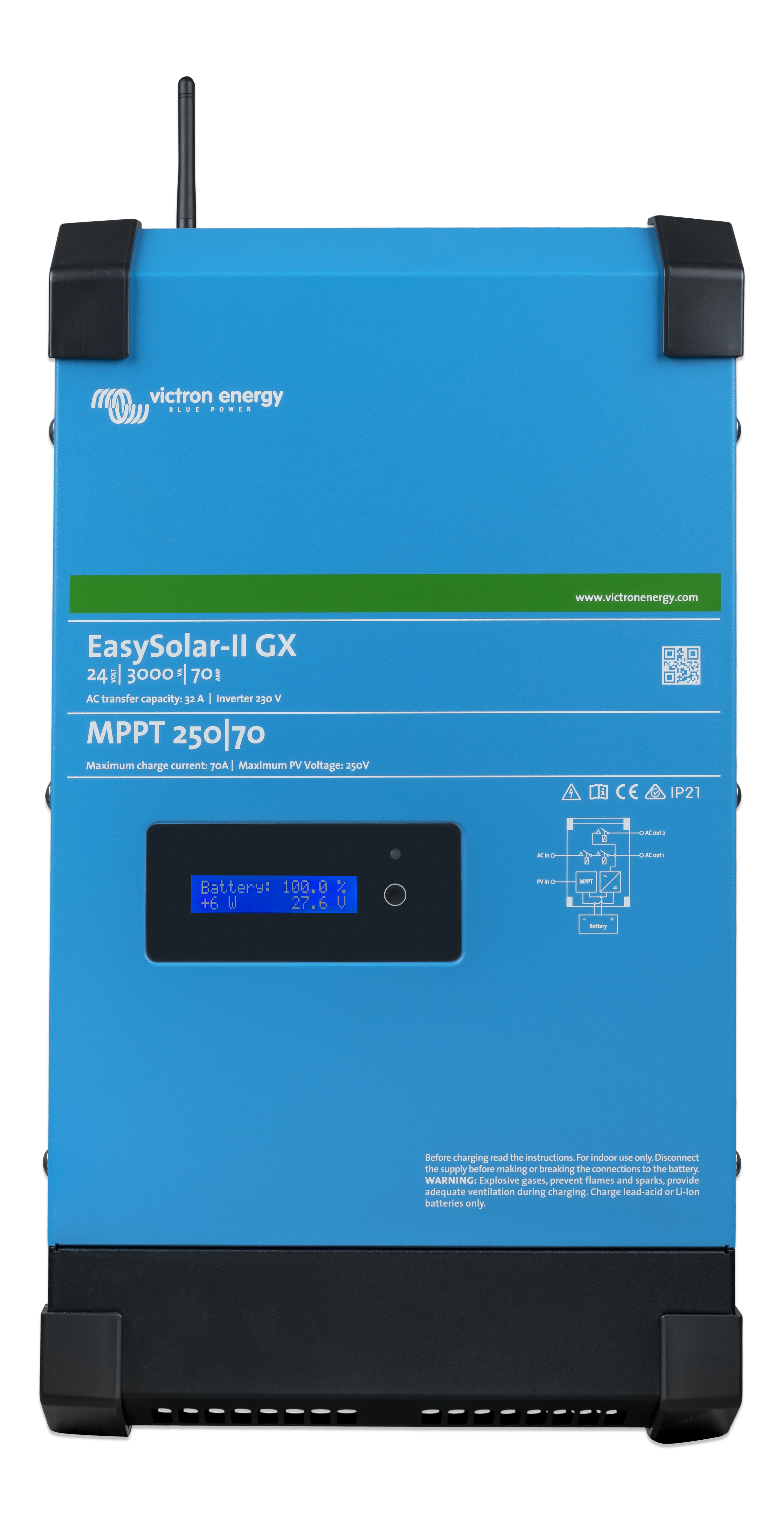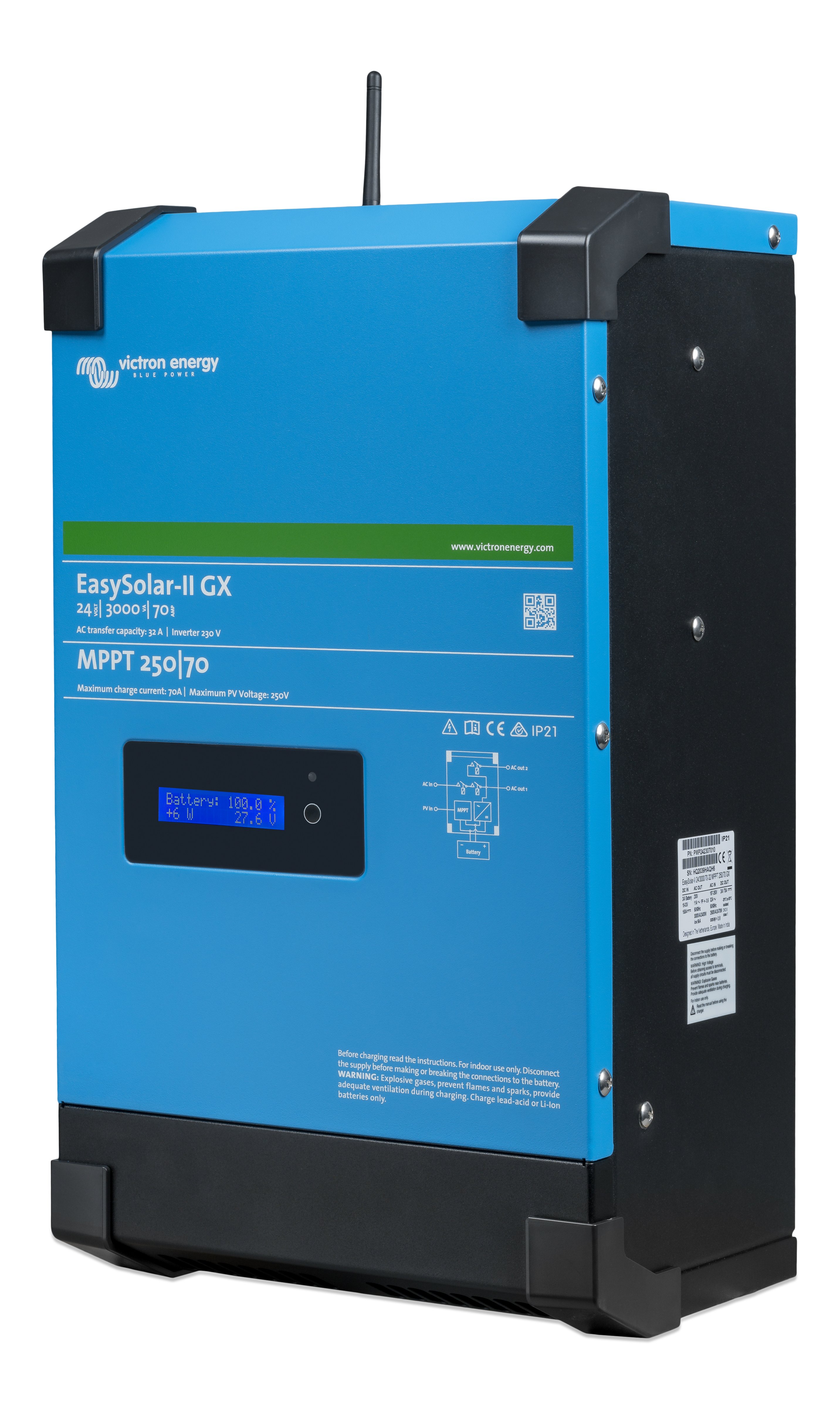 Den har innebygd MPPT regulator, Inverter, lader, GX enhet og AC fordeler i ett og samme produkt.