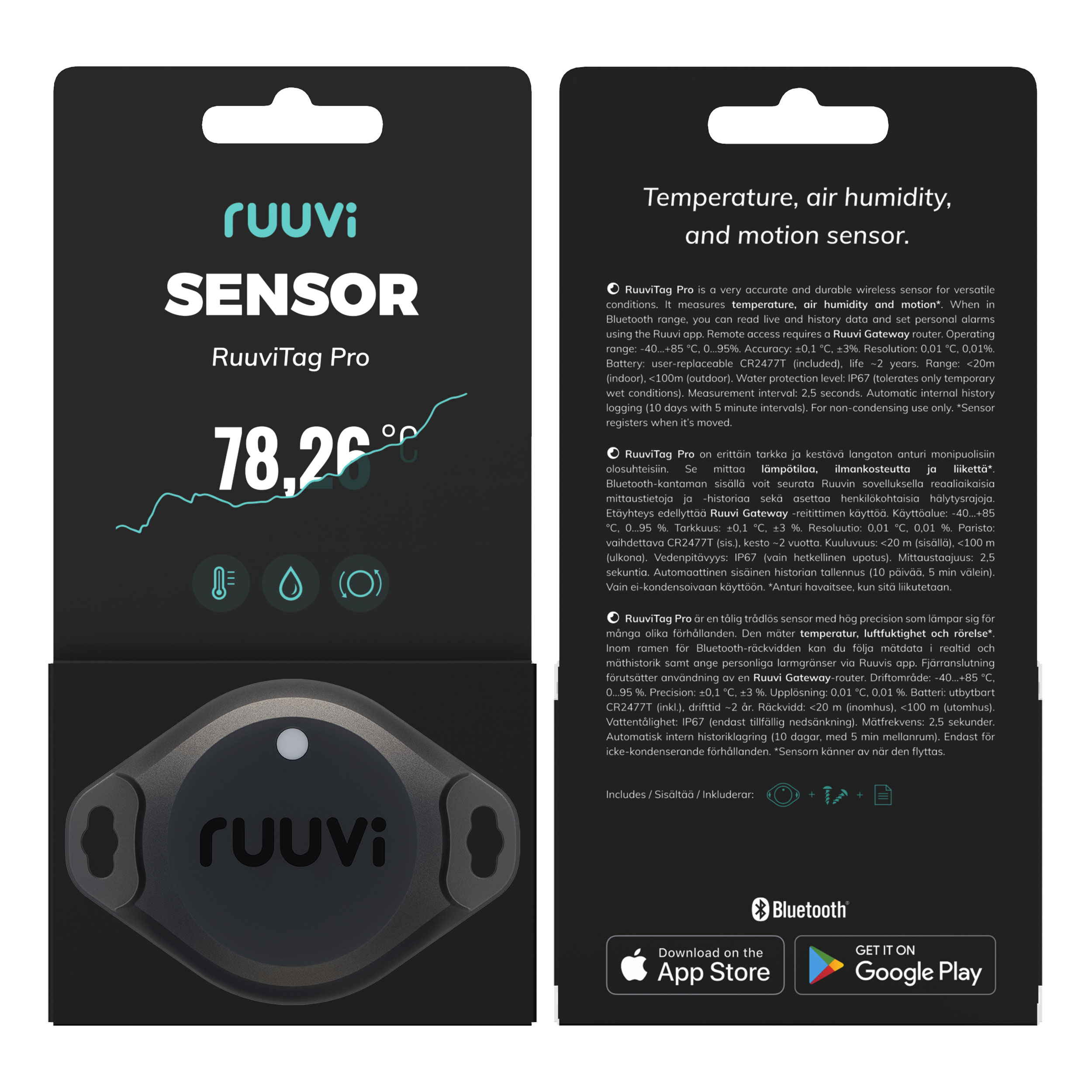 Pro er basert på RuuviTags vellykkede konsept og bringer i tillegg flere nye enestående funksjoner til bordet. RuuviTag Pro