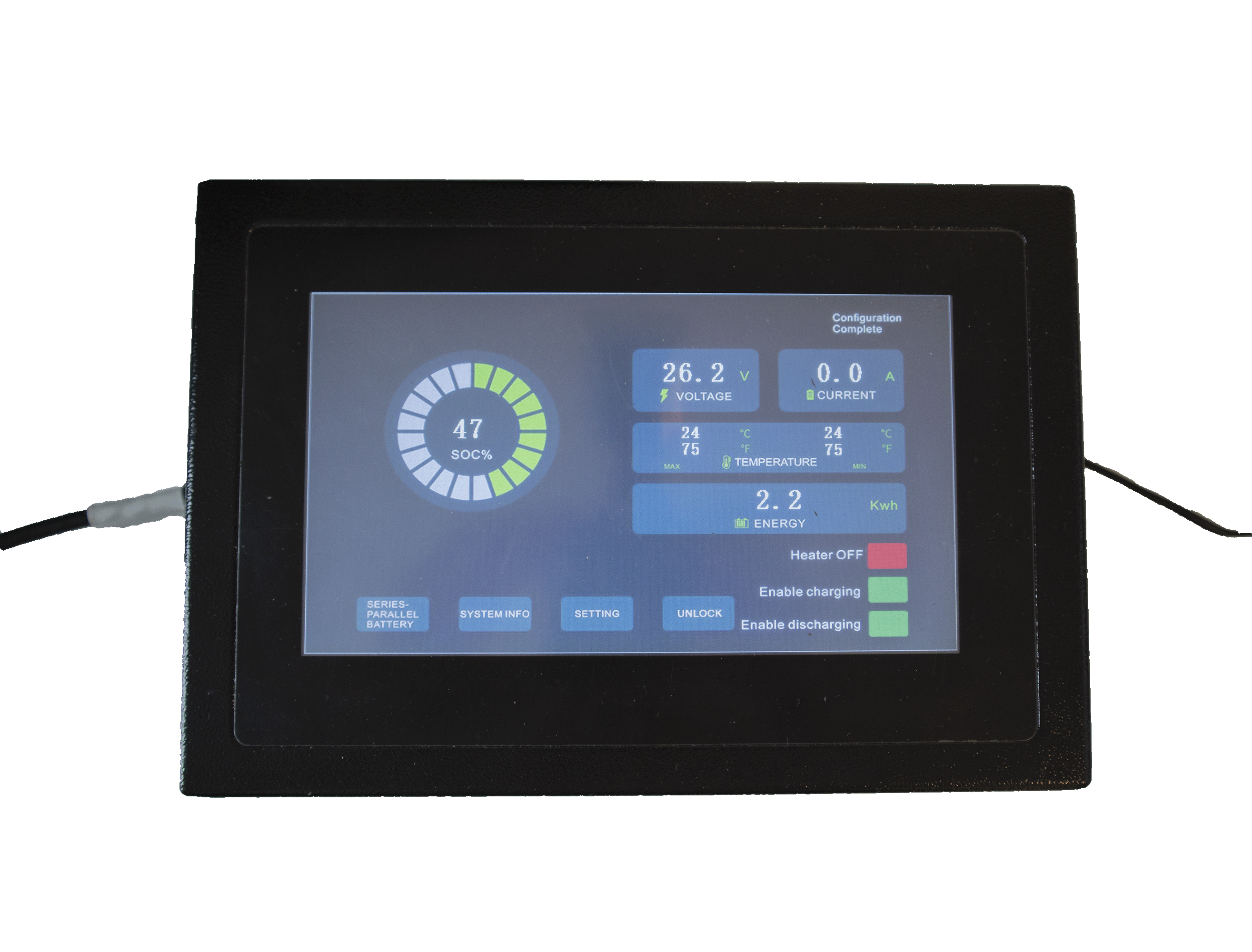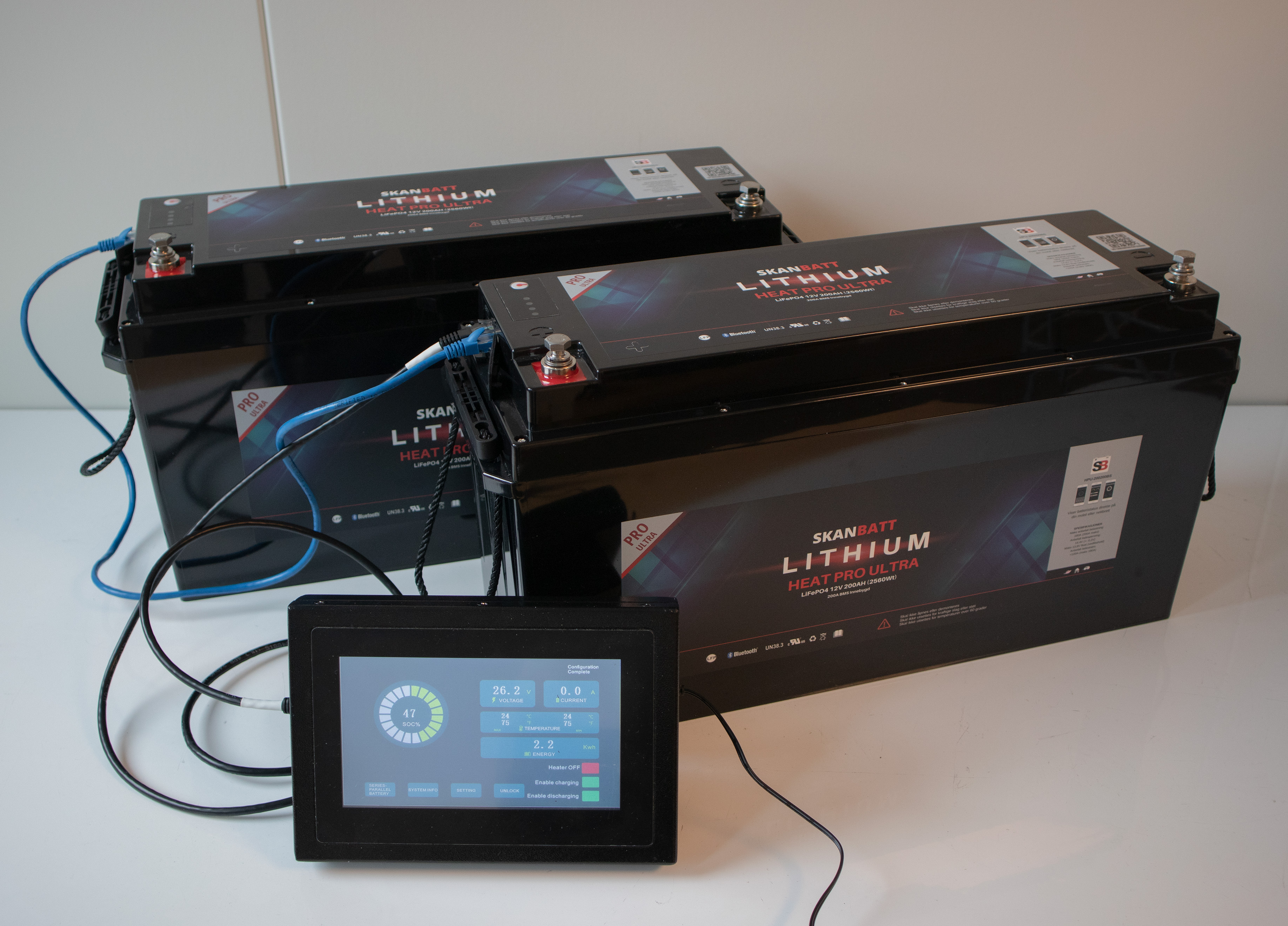 Følger med en RJ45-spesialkabel - krever en ekstra pr. batteri i serie, og strengen må termineres med en medfølgende resistordongle.