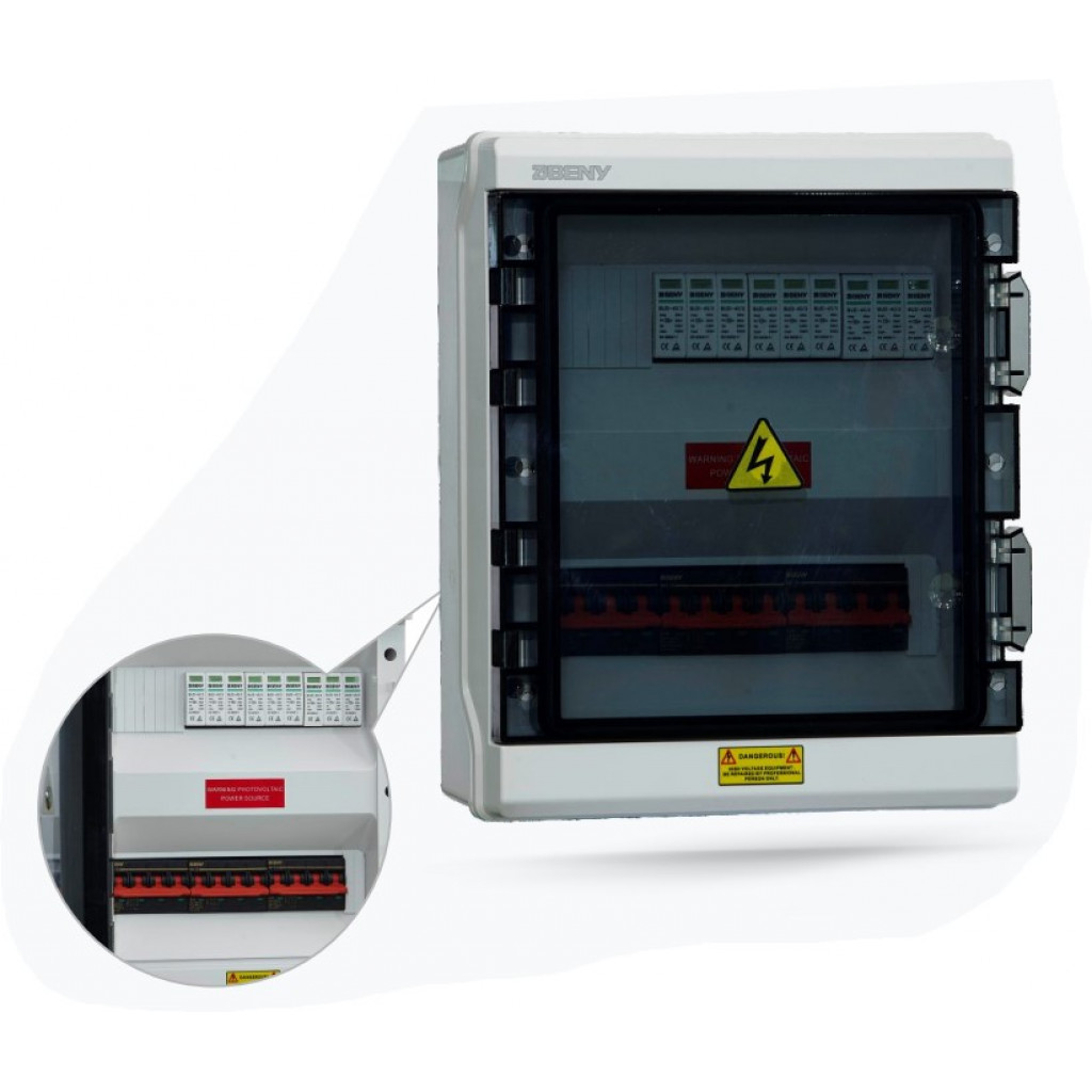 Dette er en høykvalitetsskap for å koble til inntil 3 strenger med solcellepanel. Disse strengene er overspennings- og overbelastningsbeskyttet, før de kobles videre til en inverter som evt. har inntil 3 strenger inn pr. tracker.