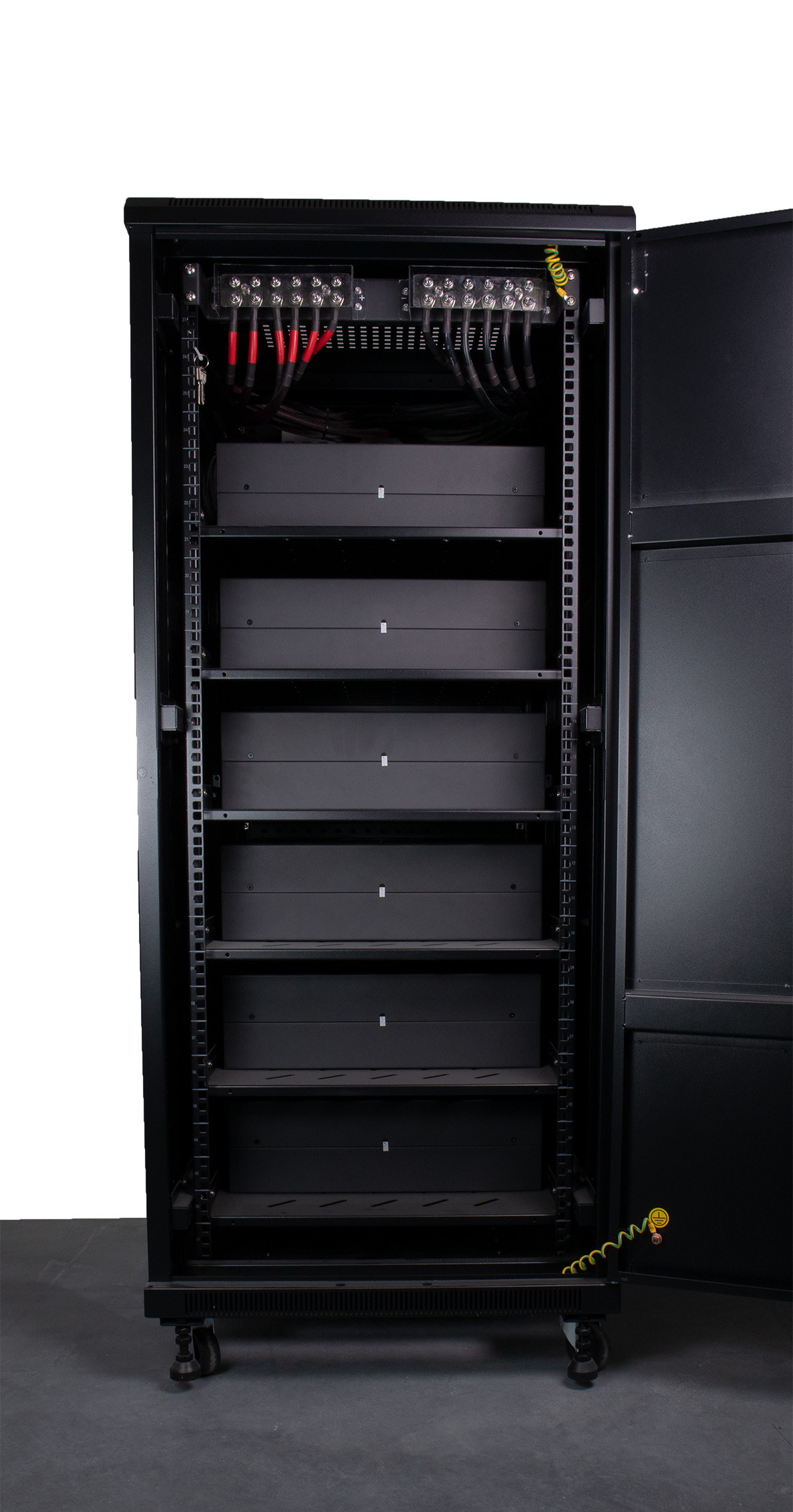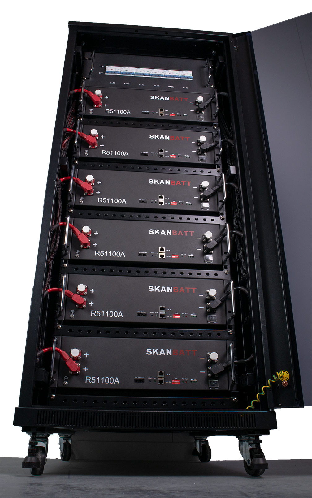 Genialt halv-rack med god plass til 6 stk. Skanbatt 3U rackbatterier (egnet for batterier med og uten varme). Det meste er ferdig montert - her putter man inn batteriene, plugger på de enkle kontaktene og kommunikasjonskabel mellom batteriene samt til inverter eller Victron Cerbo GX / Cerbo-S GX. Skapet er laget i stål og aluminium, og er meget solid. God plass til kabling.