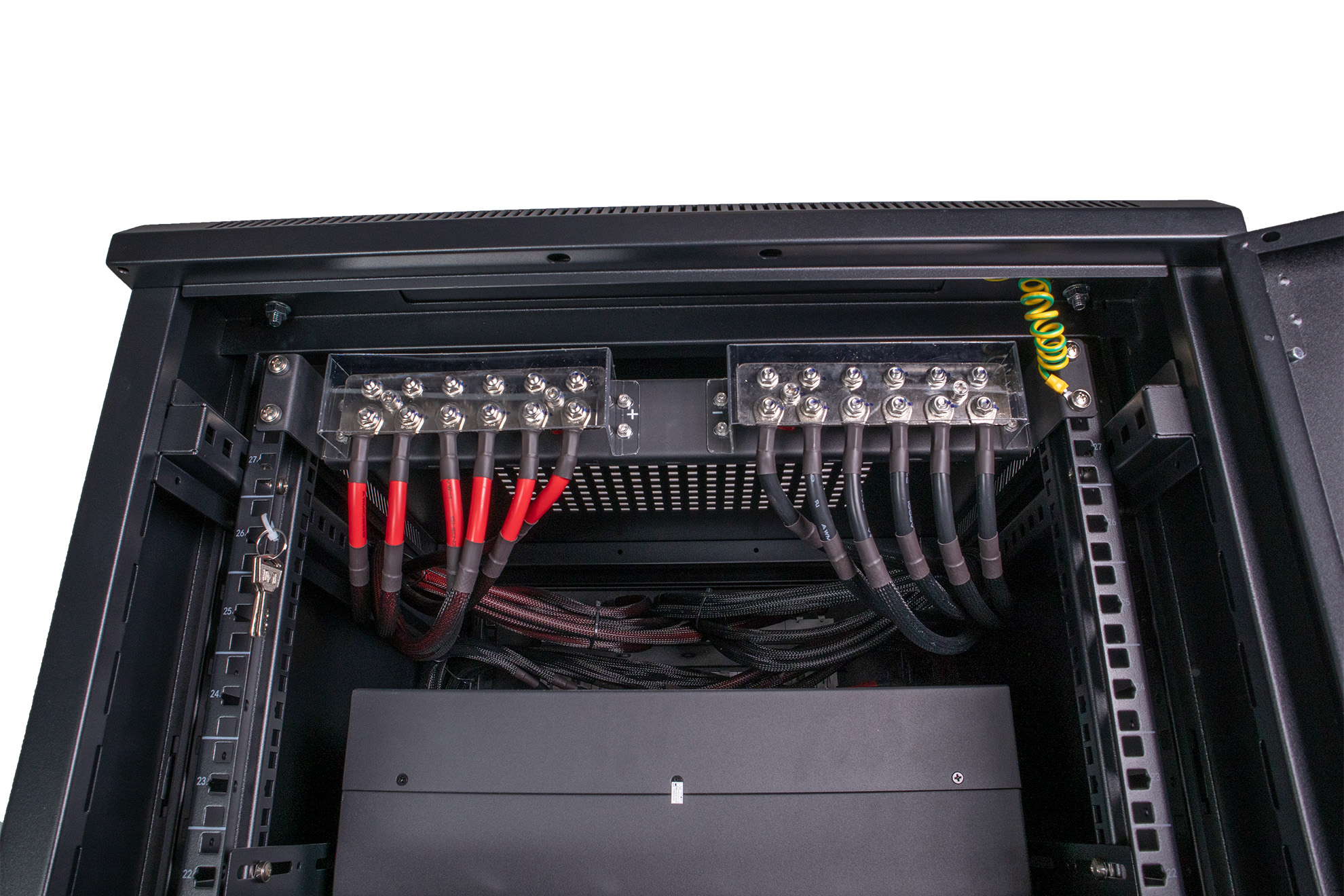 - 2x6 Amphenol 25mm2 kabler til hver hylle - alle kablene er like lange. Kablene ligger klar på hver hylle og er koblet til en sentral busbar