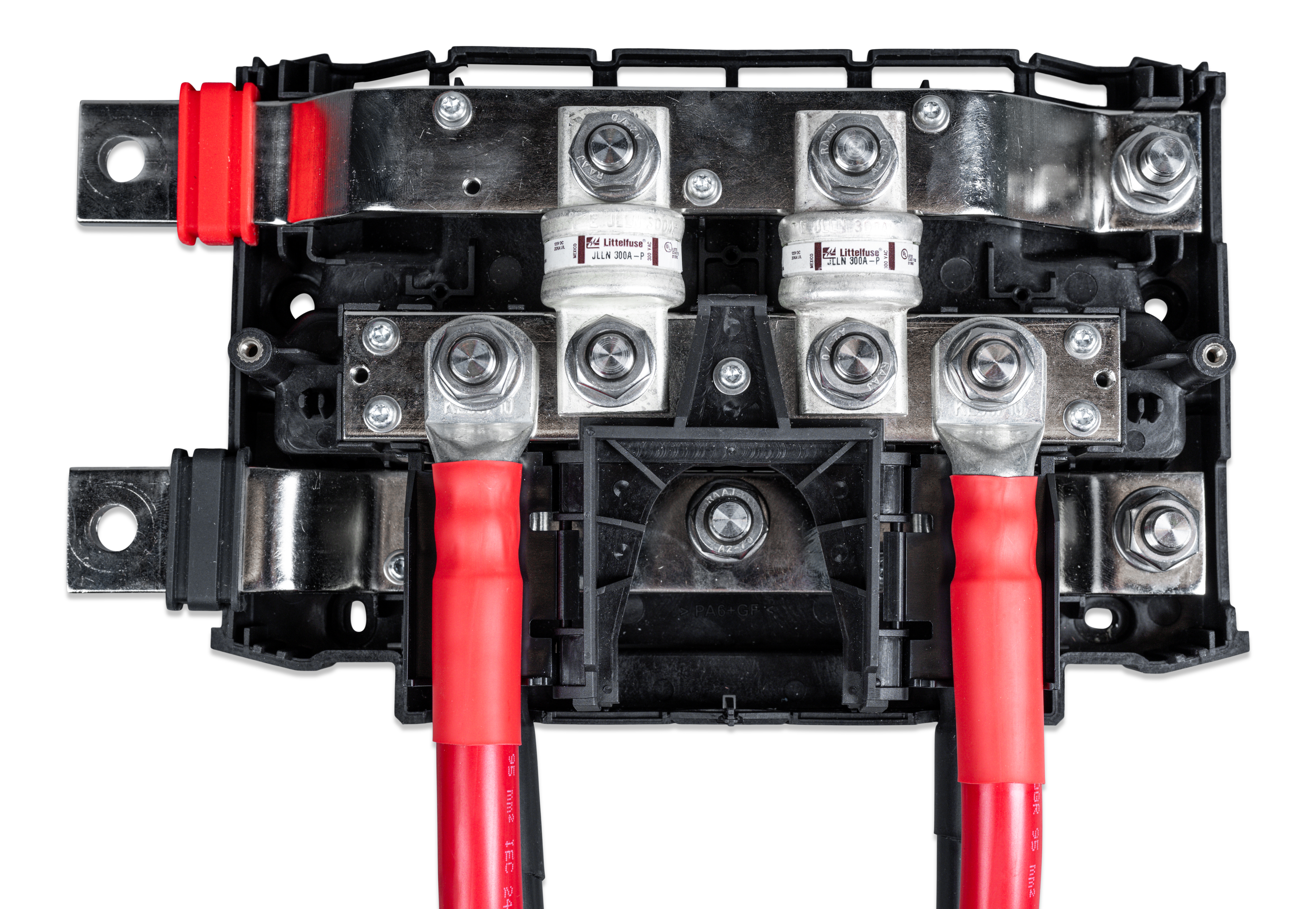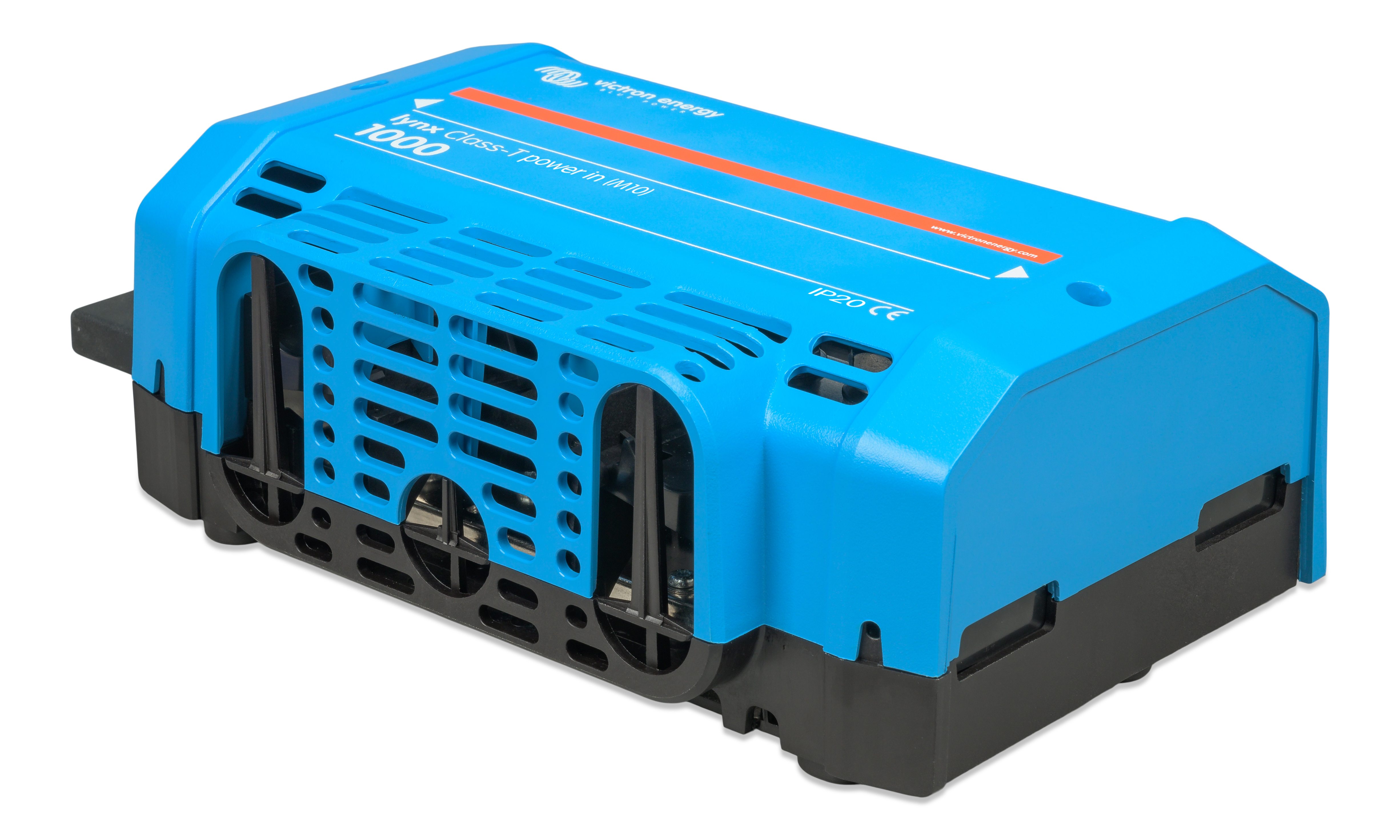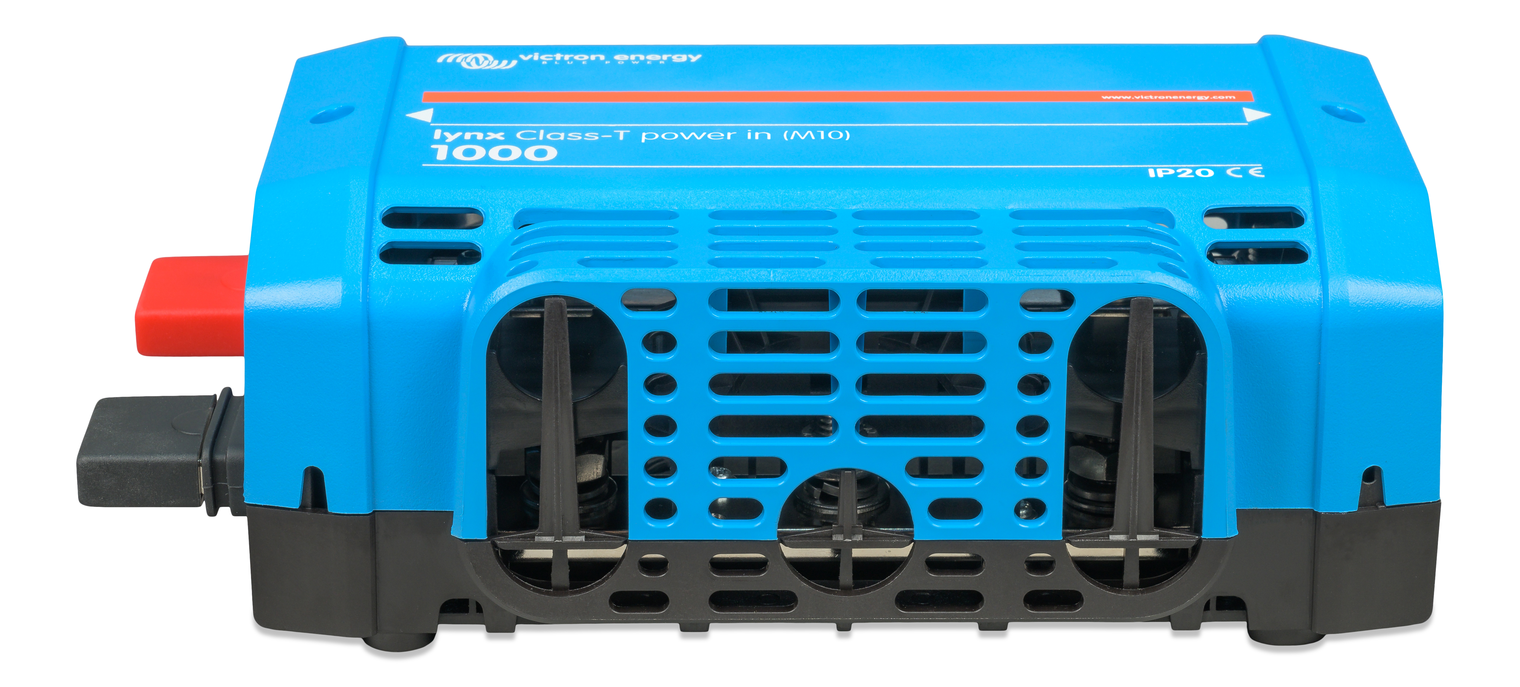 Lynx Class-T Power In kobler sammen og sikrer opptil to strenger med litiumbatterier. Den har en positiv og negativ samleskinne, tilkoblinger for to Class T-sikringer og en tilkobling for jording av likestrømssystemet. Class T-sikringene, som er tilgjengelige i 225 A, 250 A, 350 A og 400 A, må kjøpes separat.