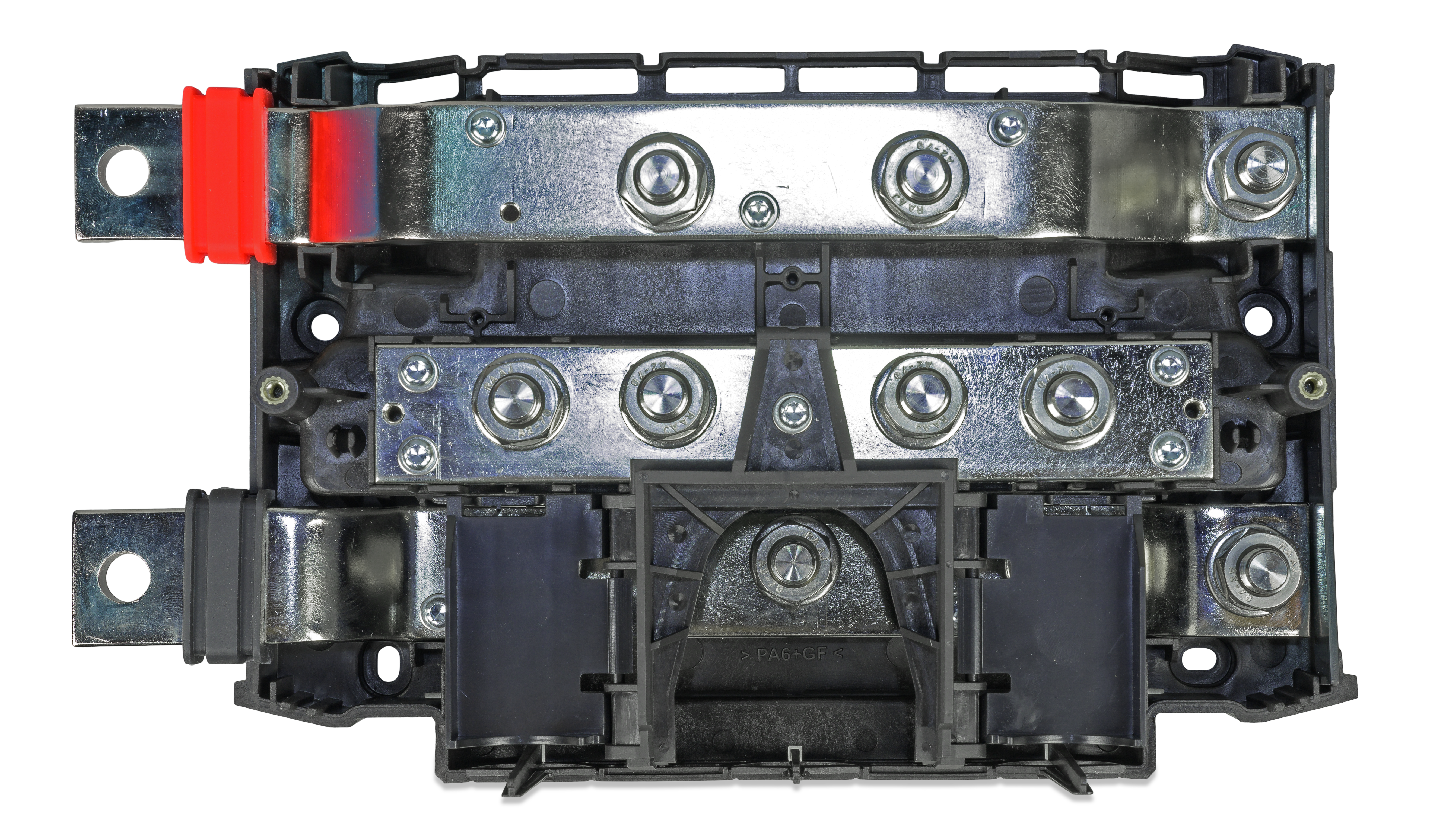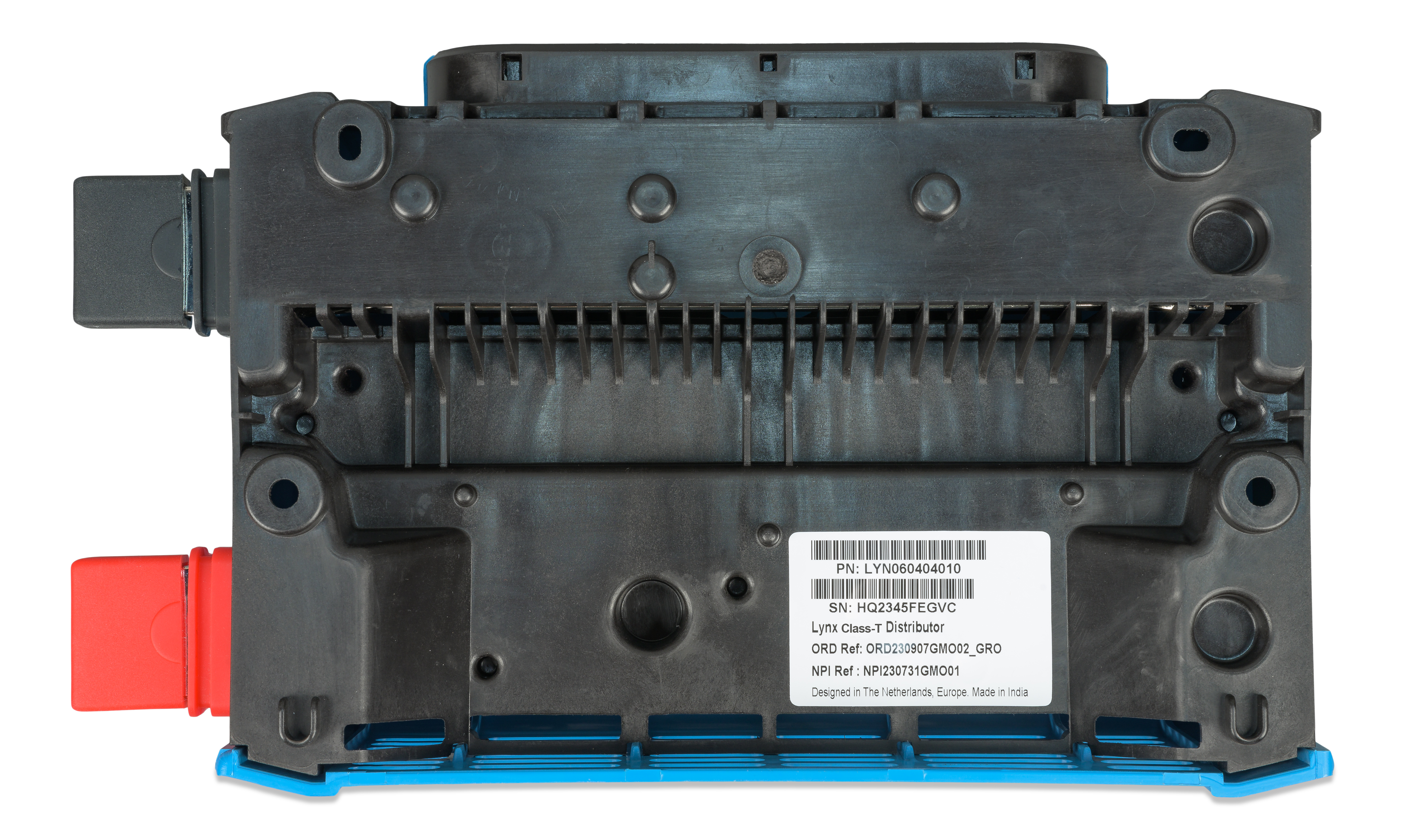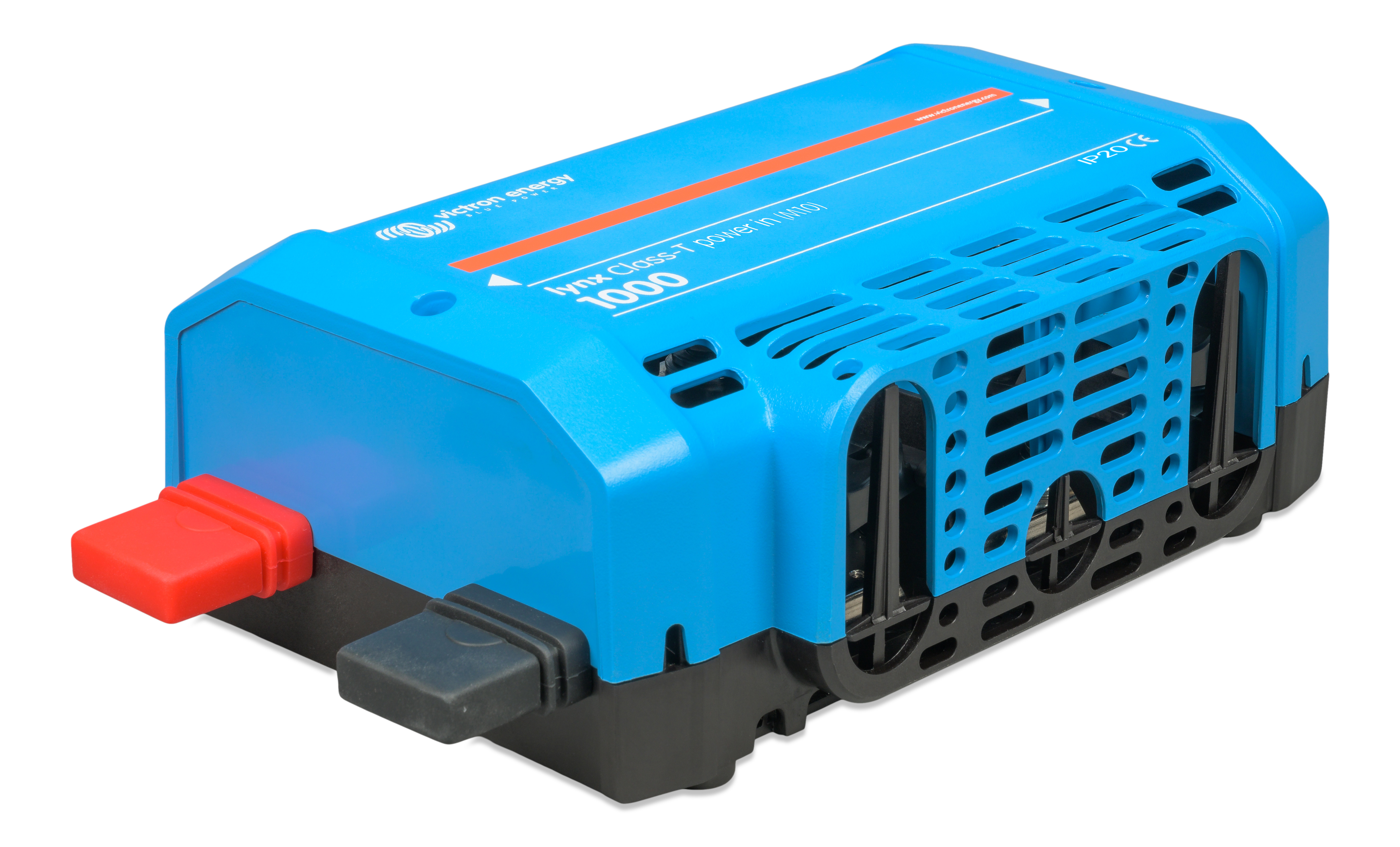 Lynx Class-T Power In kobler sammen og sikrer opptil to strenger med litiumbatterier. Den har en positiv og negativ samleskinne, tilkoblinger for to Class T-sikringer og en tilkobling for jording av likestrømssystemet. Class T-sikringene, som er tilgjengelige i 225 A, 250 A, 350 A og 400 A, må kjøpes separat.