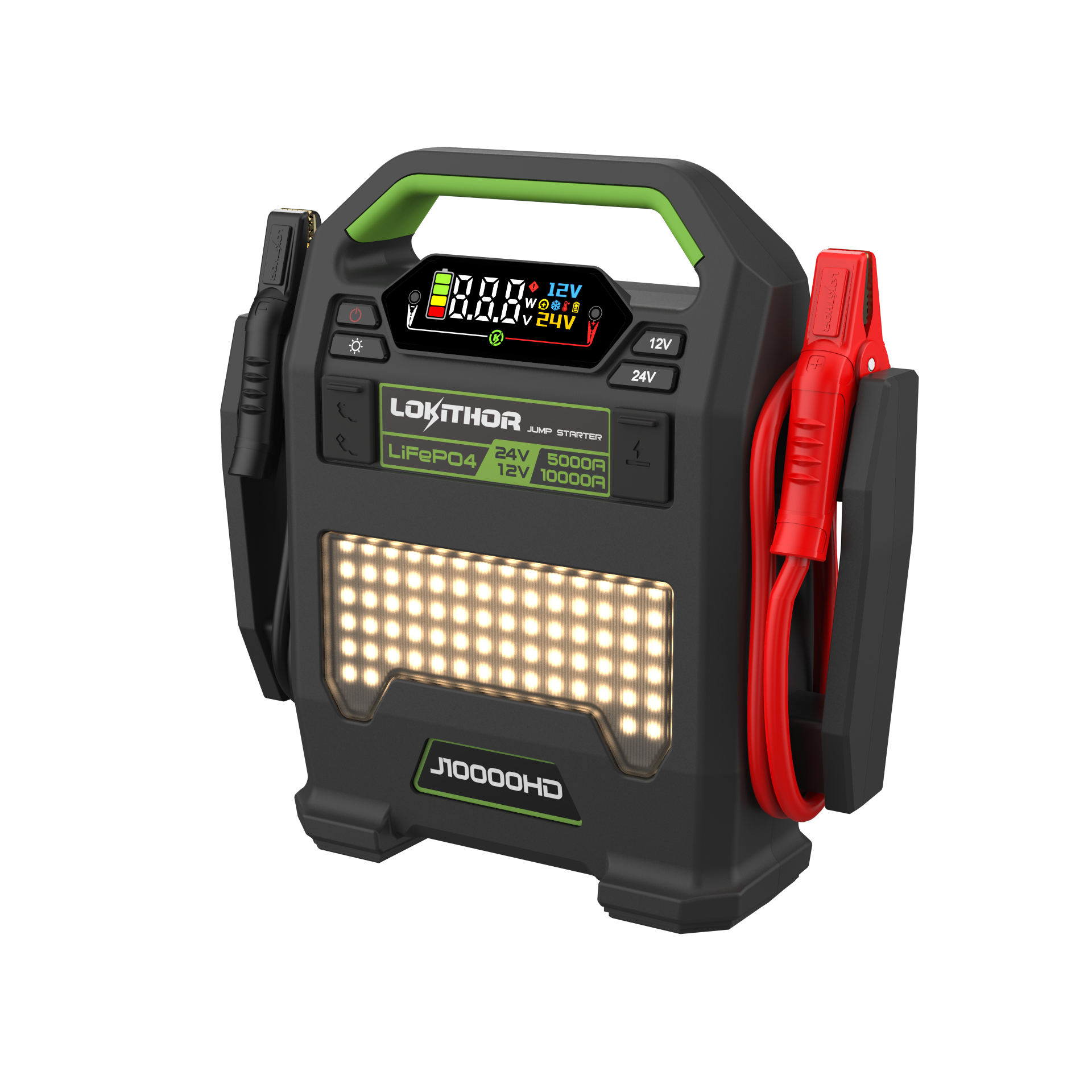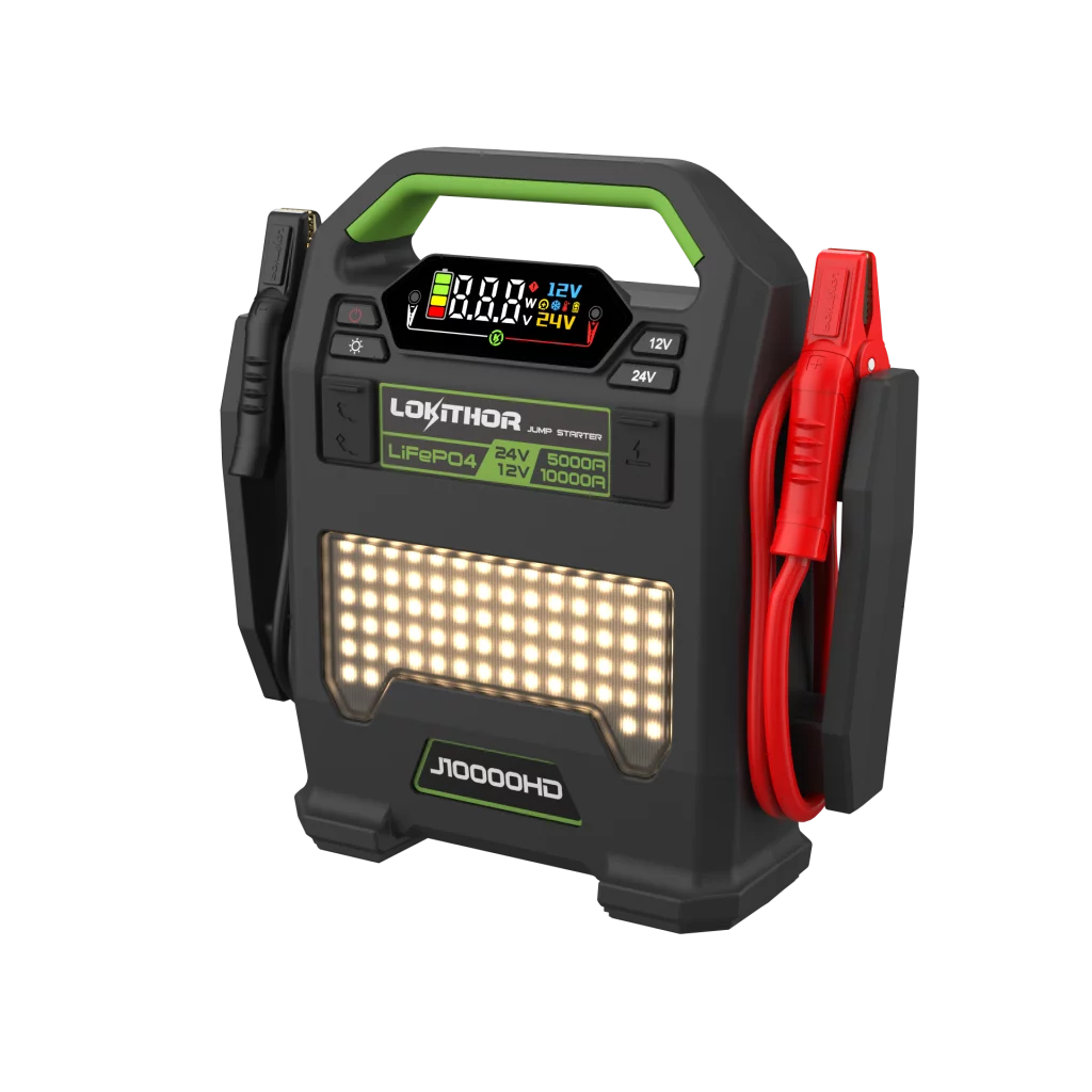 Lokithor J10000HD – Heavy Duty starthjelp for 12V/24V 10 000A (12V) • 5 000A (24V) • LiFePO₄ • ConnectMax sikkerhet • Taktisk LED-lykt J10000HD er en profesjonell starthjelper for krevende kjøretøy og maskiner. Den kombinerer ekstrem startstrøm for både 12V og 24V systemer med robust